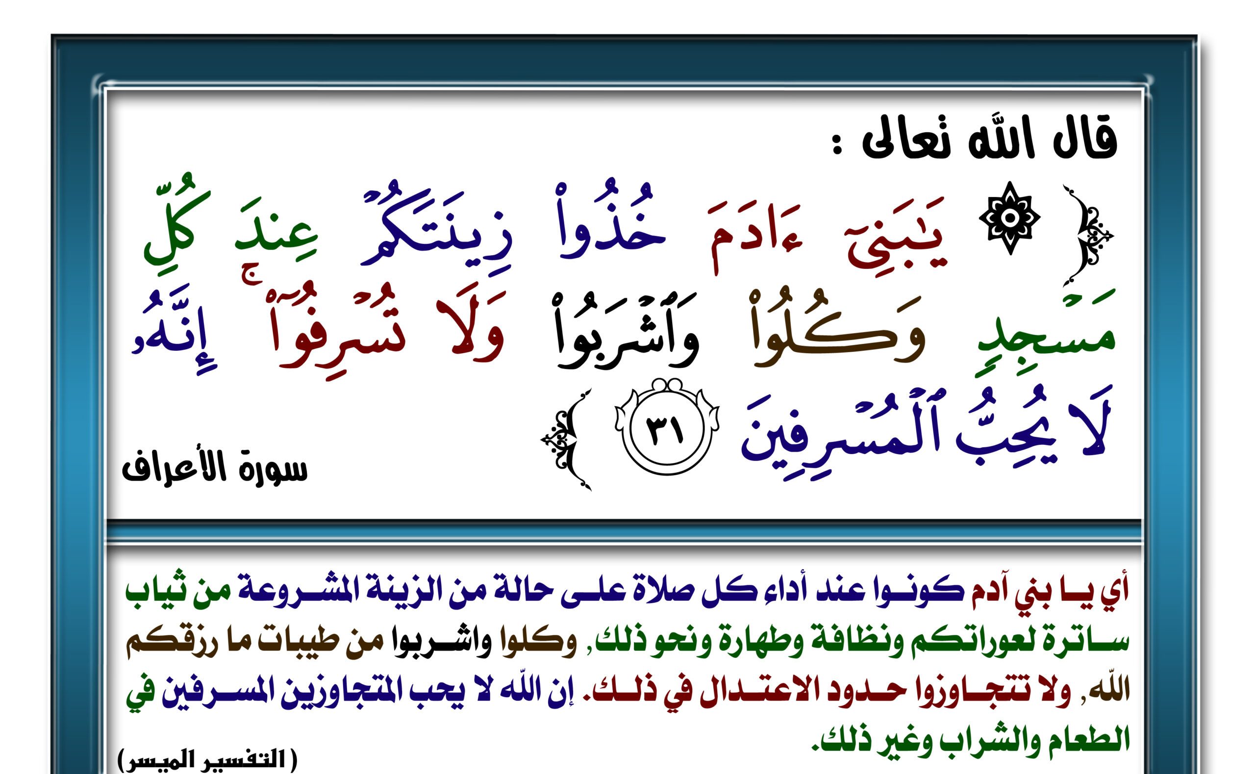 الآية 31 من سورة الأعراف: قال تعالى: “يَا بَنِي آدَمَ خُذُواْ زِينَتَكُمْ عِندَ كلِّ مَسْجِدٍ وكلواْ وَاشْرَبواْ وَلاَ تُسْرِفواْ إِنَّهُ لاَ يحِبّ الْمسْرِفِينَ”.