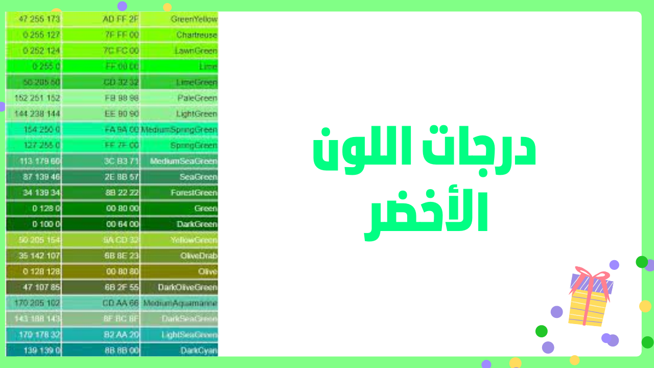 يعد استخدام الألوان وتدرجاتها واحدة من أساليب اظهار الجمال والرونق، عدا عن اظهار مدى فن المصمم، وذوقه الرفيع في ابراز جمال اللوحة أو اليكورات وغيرها، فقد اشتهرت عدد من بيوت الأزياء التي عاد لتناسق الألوان الذي تظهره الدور الكبير في الشهرة التي نالت عليها، وهذا جاء من توظيف تدرجات الألوان فيها بعناية فائقة، ومن أبرز الألوان التي لها عدد كبير من الترجات، هو اللون الأخضر، الذي تميز بأنه رمز للصفاء والنقاء، ويعطي الاحساس بالراحة والاستراخاء، لهذا يعد من أفضل الألوان على الاطلاق، كما وأننا نشاهد طلات المشاهير المميزة بهذا اللون، وجدير بالذكر أن تدرجات اللون الأخضر ما هي الا اختلاف في الألوان الممزوجة مع اللون الأخضر، ان كان لون أبيض أو غيره من مجموعة من الألوان المميزة، ومن أشهر تدرجات اللون الأخضر ما يلي: