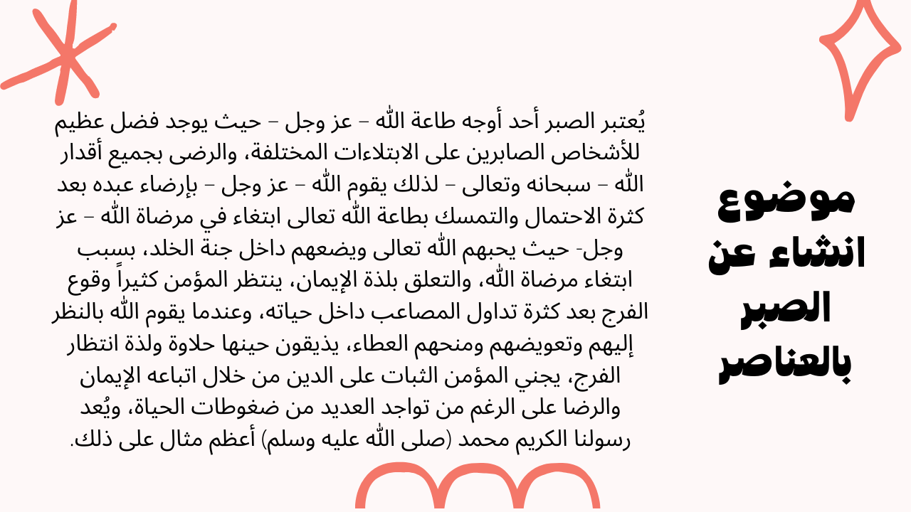 يعتبر انشاء عن الصبر كامل إذا وفقط إذا توفرت فيه كافة الشروط الواجب توافرها في موضوع التعبير، وهذه الأجزاء المتكاملة تجعل الكاتب يخرج أفكاره متسلسلة دون أية فراغات أو قفزات يشعر بها القارئ، كما وأنها تسهم إسهاماً واضحاً في الاستمرار بالقراءة دون أية معضلات أو الشعور بالملل والضجر، ومن هنا نرفق لكم انشاء عن الصبر كامل العناصر: