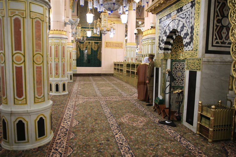 - وحجرة أم المؤمنين عائشة رضي الله عنها والمنبر النبوي الشريف.