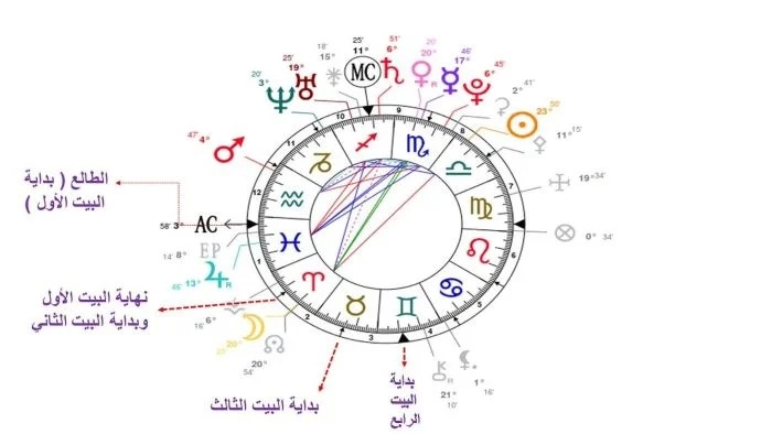 - الخريطة الفلكية بالعربي وهي التي تساعد في توضيح موقع وشكل الكواكب أثناء ولادة الشخص “ميلاد”.