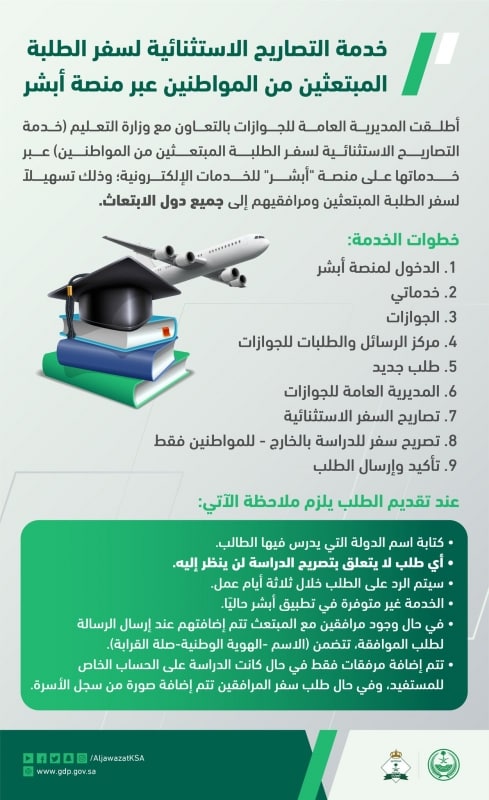 لقد أعلنت الجوازات السعودية من خلال حسابها الخاص عبر منصة التواصل الاجتماعي تويتر عن بداية استقبال طلبات من أجل التمكن من السفر إلى الخارج. وذلك من أجل الدراسة. مع توضيح كافة الشروط الضرورية اللازم توفرها في كافة الراغبين بالتقديم بالشكل الإلكتروني من خلال الموقع الرسمي الخاص بمنصة أبشر الإلكترونية على أن يقتصر التقديم على استخراج تصريح للسفر بالخارج على مواطني المملكة العربية السعودية. كما ولقد وضحت وزارة الداخلية في المملكة العربية السعودية خدمة تصاريح السفر الاستثنائية وكافة البنود المندرجة تحت هذه الخدمة.