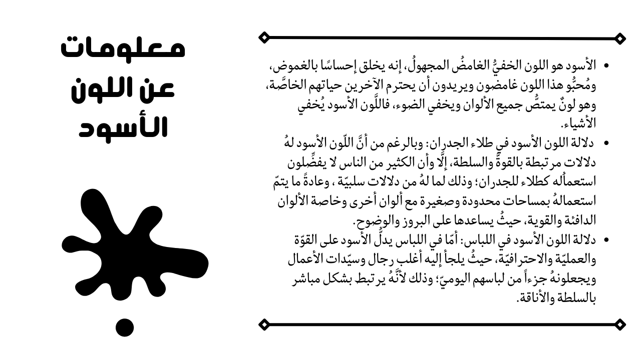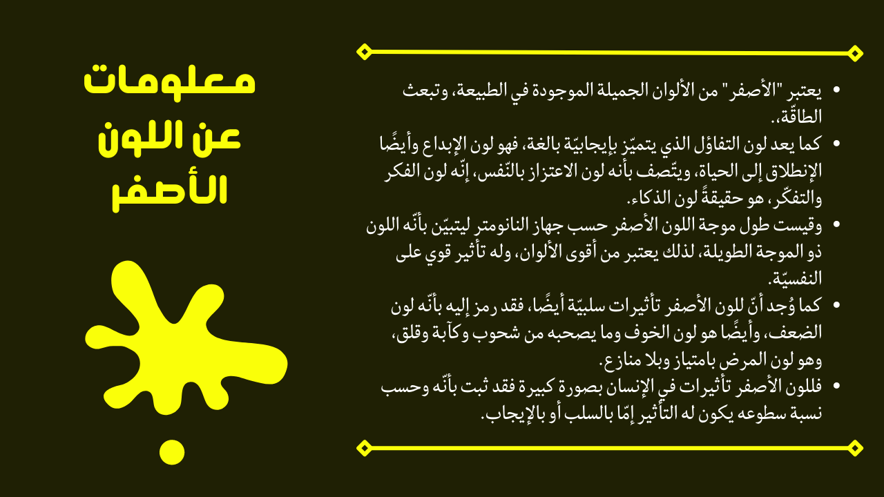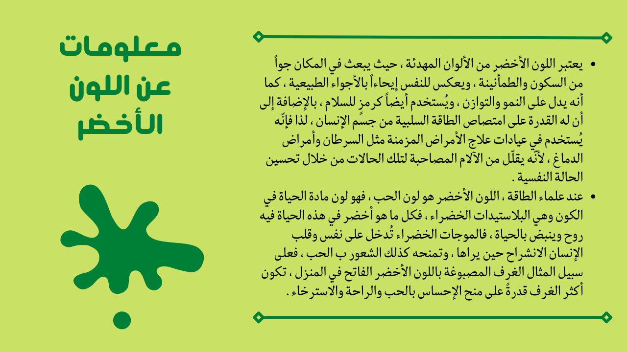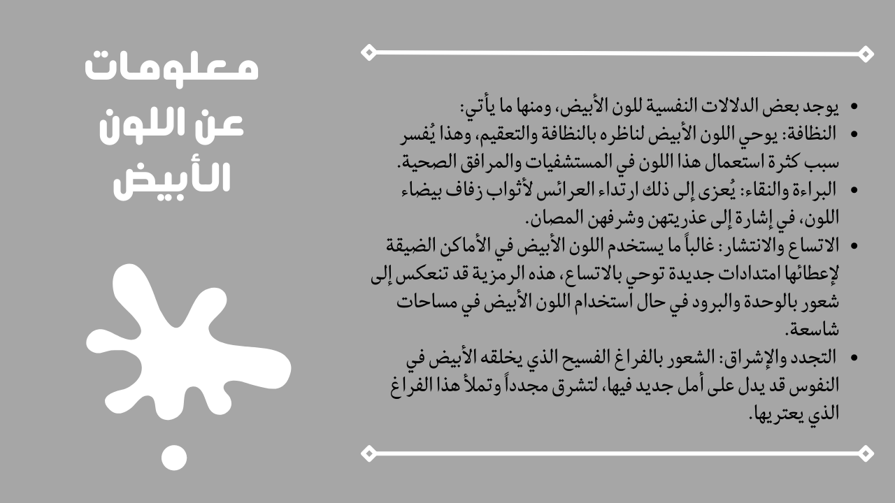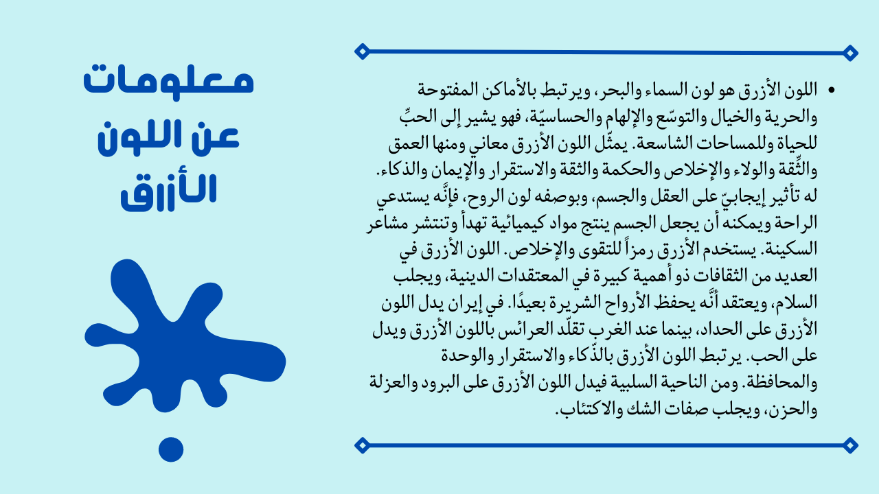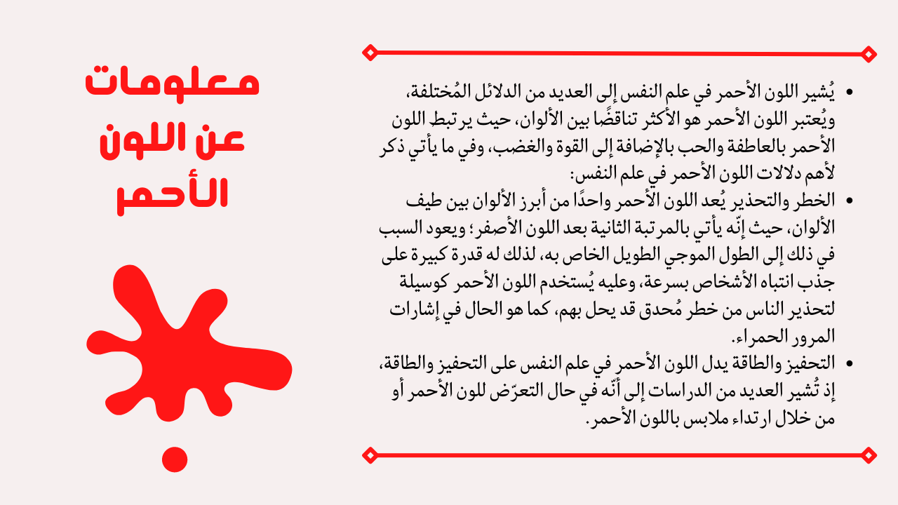 اسم لون بحرف الألف أبواسطة: Esraa Yasser–آخر تحديث: 2025-10-21 - 4:16 ص اسم لون بحرف الألف وأهم المعلومات عنه، من المعروف أن للألوان الكثير من الدلالات والرموز والاستخدامات أيضاً، وهذا الأمر جاء وليد توظيف هذه الألوان في الثقافات والحضارات المختلفة، حيث تعتبر الألوان قاعدة أساسية من ضمن القواعد التي صب الإنسان جل اهتمامه عليها أثناء انشائه الحضارات، حيث نجد أن الكثير من الحضارات القديمة ارتبطت الألوان فيها بمعاني كثيرة، وكان لكل لون منها مردوده على الكثير من مناحيها، وفي هذا السياق نرفق اسم لون بحرف الألف وأهم المعلومات عنه.اسم لون بحرف الألف أتم منح الألوان أهمية كبيرة جداً تبعاً للارتباط القوي بينها وبين حاسة البصر، كما أن هنالك ارتباط كبير بين الألوان المختلفة والأحاسيس المكنوزة في القلوب، وهذا الأمر يؤكد على الأثر الذي تتركه الألوان في نفسية الإنسان، حيث أثبتت الكثير من الدراسات النفسية بأن الألوان لها الكثير من الآثار النفسية المختلفة، وفي هذا السياق نرفق اسم لون بحرف الألف:معلومات عن اللون الأبيضمعلومات عن اللون الأسود أشاهد أيضاً: ماذا قيل في حرف الألف وأجمل ماقيللون يبدأ بحرف الألف أتعتبر الألوان من ضمن أهم المعايير التي يتم من خلالها تمييز الأشياء الموجودة في الطبيعة، حيث اتخذت هذه الأشياء ألوان مختلفة عن غيرها، وكان لكل لون تحمله هذه الأشياء دلالته الخاصة به، كما تم تقسيم الألوان لعدة تقسيمات، فمنها الألوان الرئيسية والألوان الثانوية، ومن منطلق الحديث حول الألوان نتبين اسم لون بحرف الألف:معلومات عن اللون الأخضرمعلومات عن اللون الأزرقاسم لون بحرف الألف ألا تقتصر تأثيرات الألوان على نفسية الإنسان، بل أثرت الألوان بشكل كبير على كل شيء يحيط بالإنسان، حيث تركت تأثيرها الواضح على أسلوب الأزياء والملابس، كما أنها تركت تأثيراً كبيراً على الديكورات الخاصة بالمنزل، وكان لها دور واضح في علاج الكثير من الأمراض، وفي هذا السياق نرفق اسم لون بحرف الألف:معلومات عن لون الأحمرمعلومات عن اللون الأصفرشاهد أيضاً: حرف الألف بجميع أشكالهلون بحرف الألف أ وتأثيرها على الحالة النفسيةتختلف تأثيرات الألوان على الحالة النفسية للإنسان، وفي سياق الحديث حول الألوان التي تبدأ بحرف الألف نتبين تأثيرات اللون الأبيض والأخضر والأزرق والأحمر والأصفر على نفسية الإنسان:لون الأبيضالتأثير النفسي: يؤدي للشعور بالراحة والسكينة والطمأنينة.كذلك التأثر العلاجي: يستخدم لعلاج مرض الصفراء عند الأطفال.لون الأخضرالتأثير النفسي: يساهم في الشعور بالانتعاش والراحة والهدوء.كذلك التأثير العلاجي: يعمل الضوء الأخضر على تخفيض ضغط الدم.لون الأزرقالتأثير النفسي: يحفز العقل على الخيال ويساهم بالشعور بالاسترخاء والراحة والهدوء.كذلك التأثير العلاجي: يساهم في علاج الأمراض العظمية.لون الأحمرالتأثير النفسي: يساهم في التخلص من الخمول والكسل.كذلك التأثير العلاجي: يعمل على زيادة معدلات التنفس وضربات القلب.لون الأصفرالتأثير النفسي: يساهم في الإحساس بالتفاؤل والمرح.كذلك التأثير العلاجي: يستخدم لعلاج مرض السل كذلك يعمل على تنشيط العقل وتحفيزه.لون بحرف الألف أ ومعناهتتعدد معاني الألوان بصورة كبيرة، حيث أن لكل لون من الألوان الموجودة في هذا الكون معنى خاص به، وهذا المعنى يميزه عن باقي الألوان، حيث أن بعض الألوان تدل على النقاء والسعادة والبهجة، وبعضها يدل على التوتر والقلق والارتباك، وبعضها يمنح الإنسان مشاعر ايجابية والبعض الآخر يولد في الإنسان مشاعر سلبية، وفي هذا السياق نتبين معاني الألوان التي تبدأ بحرف الألف:معنى اللون الأسوديعد اللون الأسود من الألوان الذي تدل على الأناقة.كذلك يدل اللون الأسود على الاكتئاب والقوة.معنى اللون الأبيضيعد اللون الأبيض ألوان النقاء والبراءة والعذرية.كذلك يرمز للنظافة والسلام وللاستسلام.معنى اللون الأحمريعد اللون الأحمر من ألون الحب والغضب والدفء.كذلك يرمز ال