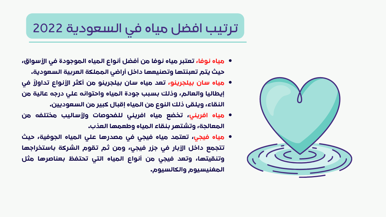 - تعد من المياه العذبة والنقية حيث يتم استخراجها من مصادر جوفية طبيعية نقية، وبالتحديد من منطقة نفود سعد؟