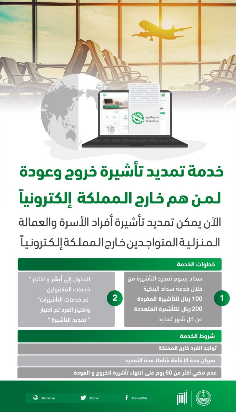 - وبالتالي فان رسوم تمديد تأشيرة الخروج والعودة لمن هم خارج المملكة 100 ريال سعودي للتأشيرة الواحدة