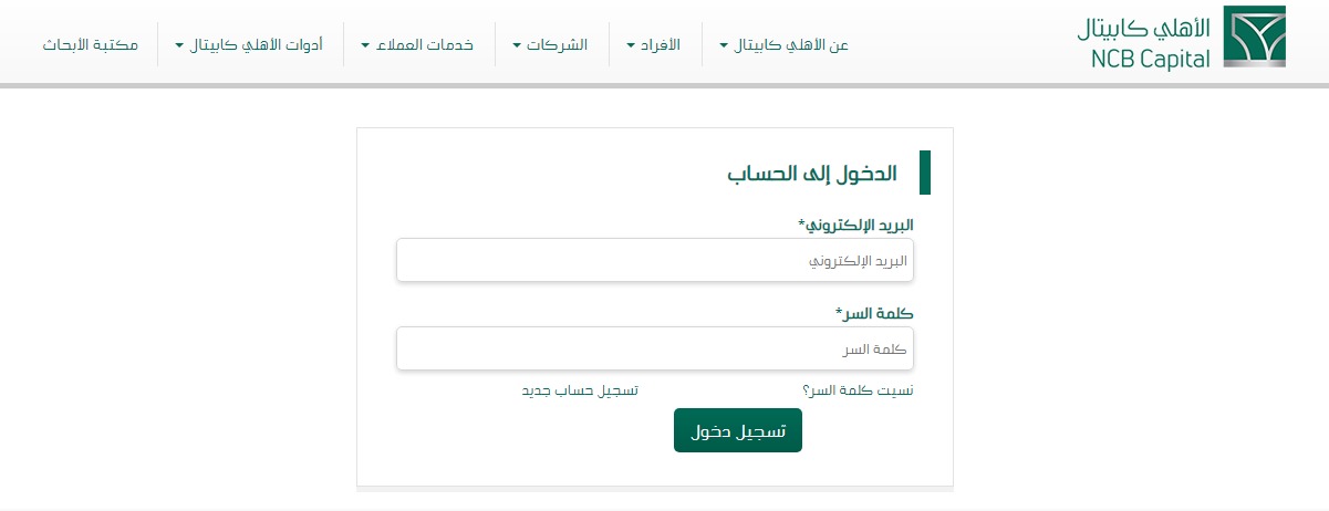 - بداية يتطلب منك أن تقوم بتسجيل الدخول إلى الموقع الرسمي الخاص برابط التسجيل في الأهلي كابيتال.
