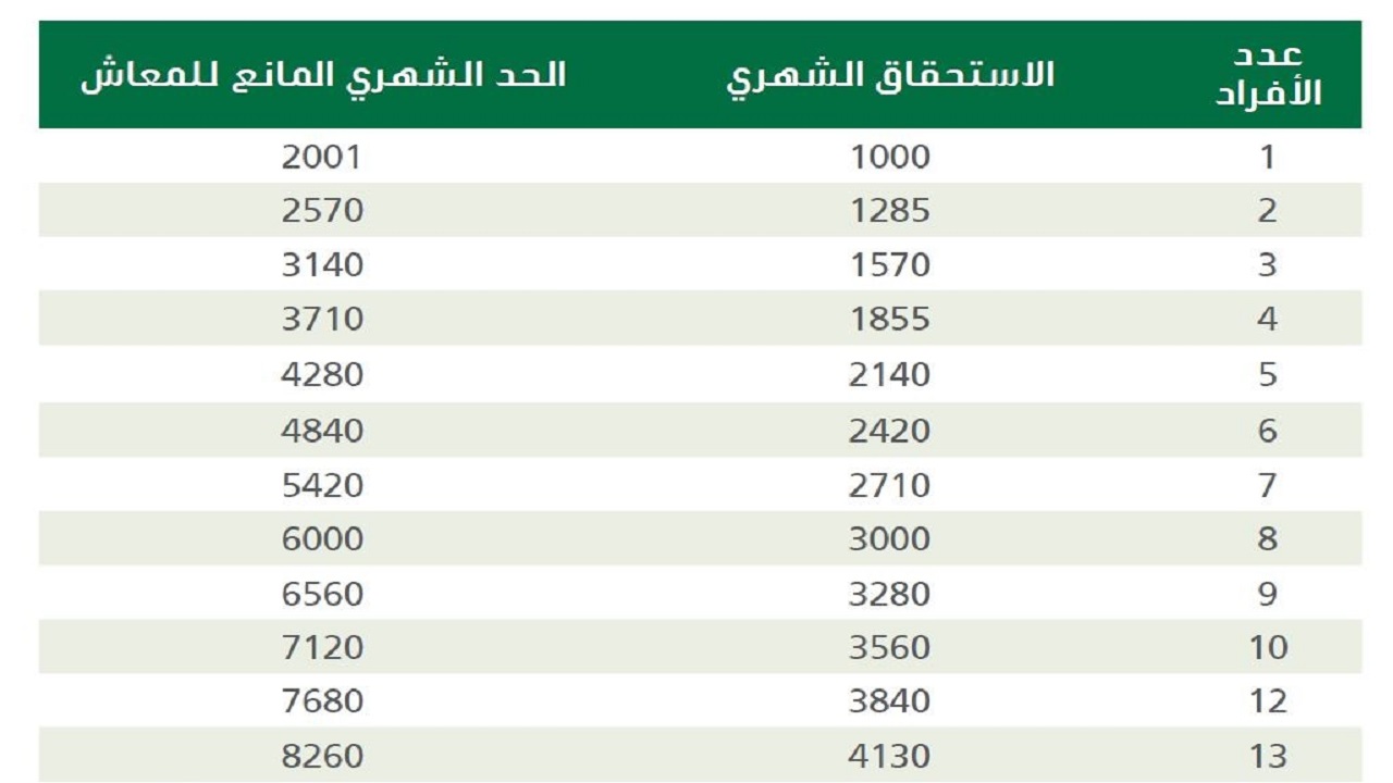- ثم يتم مقارنة المجموع تبعاً لاستحقاق الشهري المعتمد لعدد أفراد الأسرة، ويكون هذا الأمر بالشكل التالي: