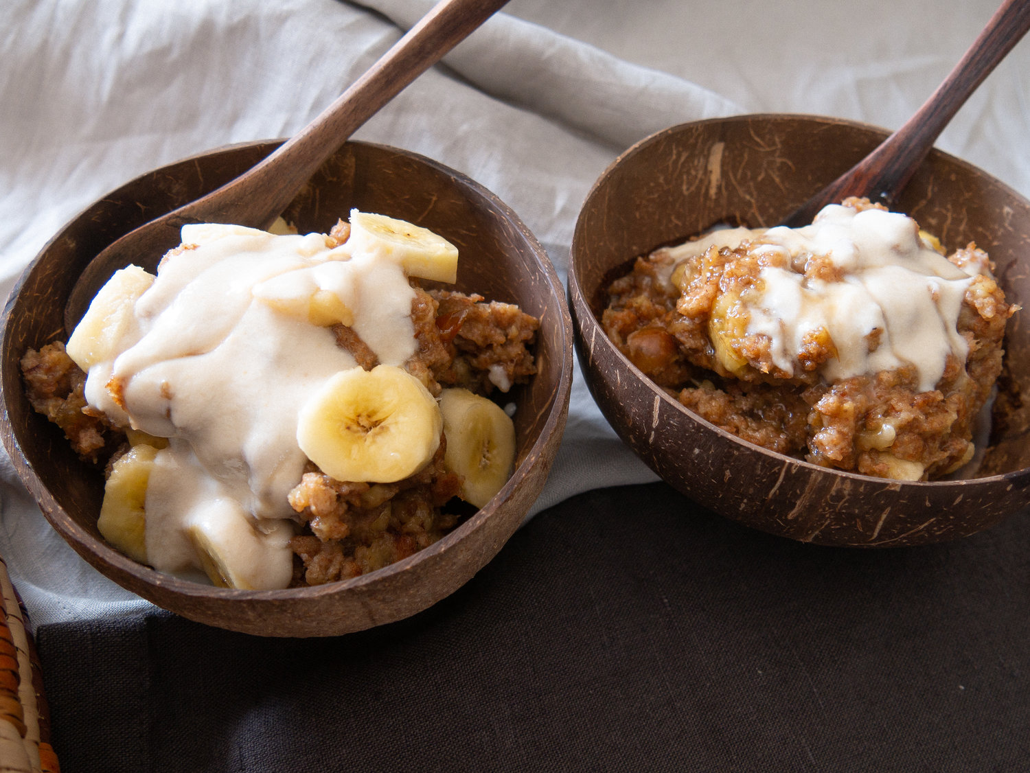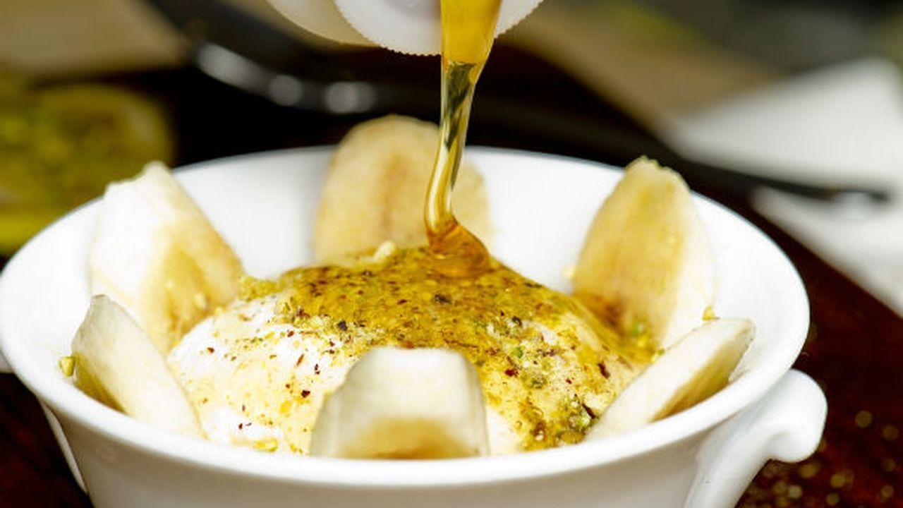 - بعد أن تحمر العجينة يتم إخراجها واضافة الموز والقشدة والعسل والبلح.