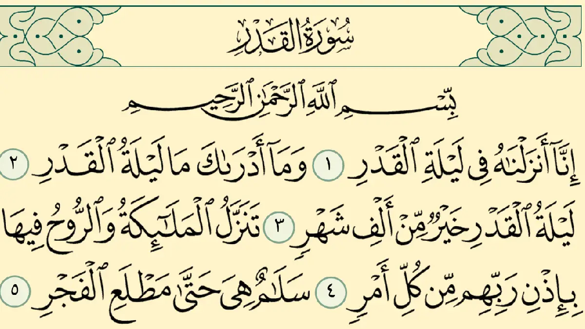 - قوله تعالى في سورة القدر: {إِنَّا أنْزَلْنَاه فِي لَيْلَةِ الْقَدْرِ * وَمَا أَدْرَاكَ مَا لَيْلَة الْقَدْرِ * ليلة الْقَدْرِ خَيْرٌ مِنْ أَلْفِ شَهْرٍ}.