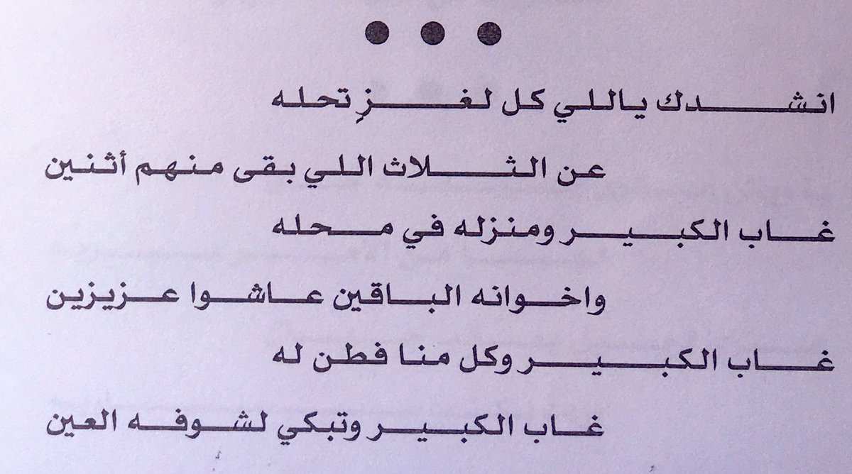- يا ويش رجل أخذ ثنتين من البيض، عاشق يرقد بينهما والكل يراه، لا أخذهن على الدين ولا أخذهن بدعة، وللتوضيح أول حروفه هو الكاف.