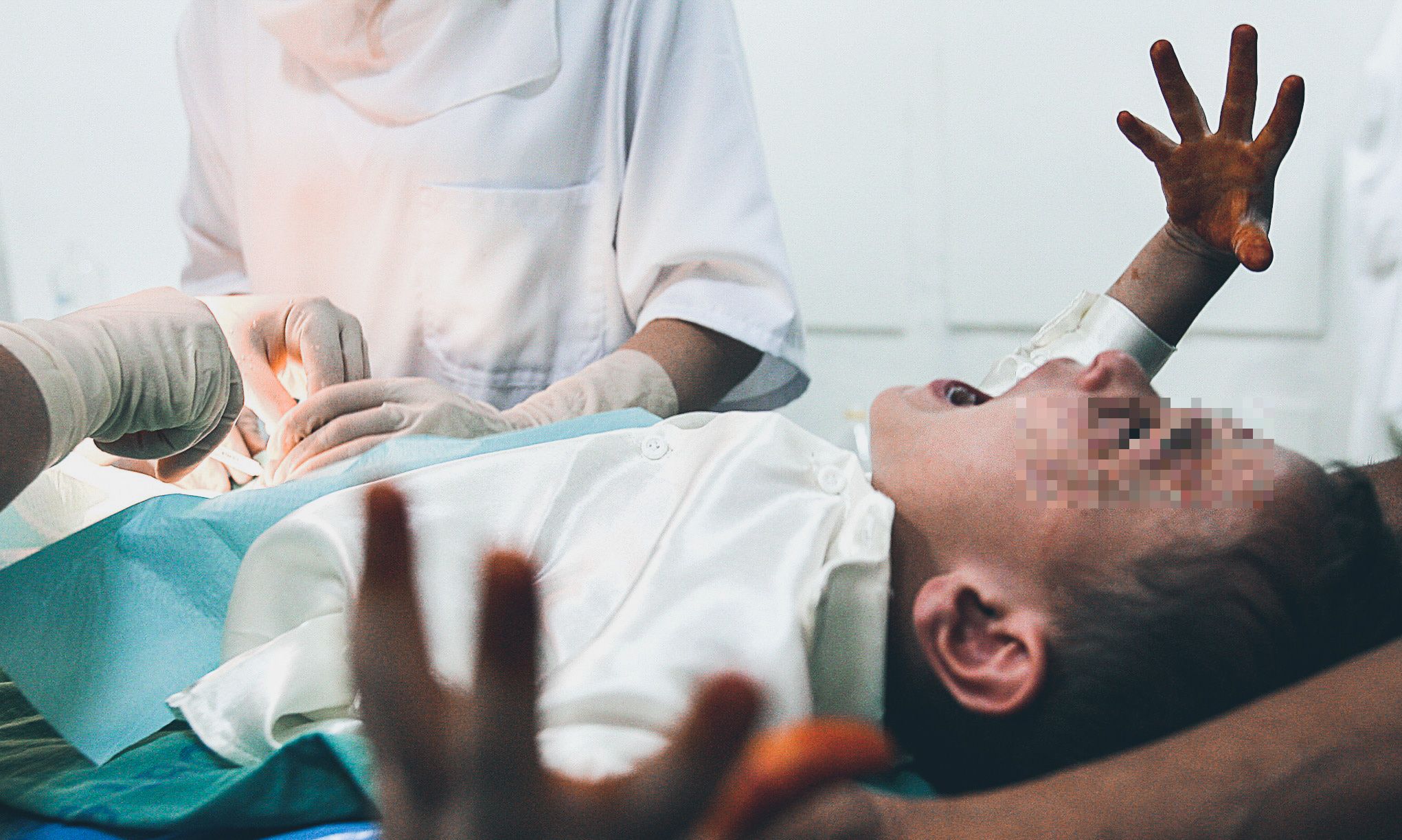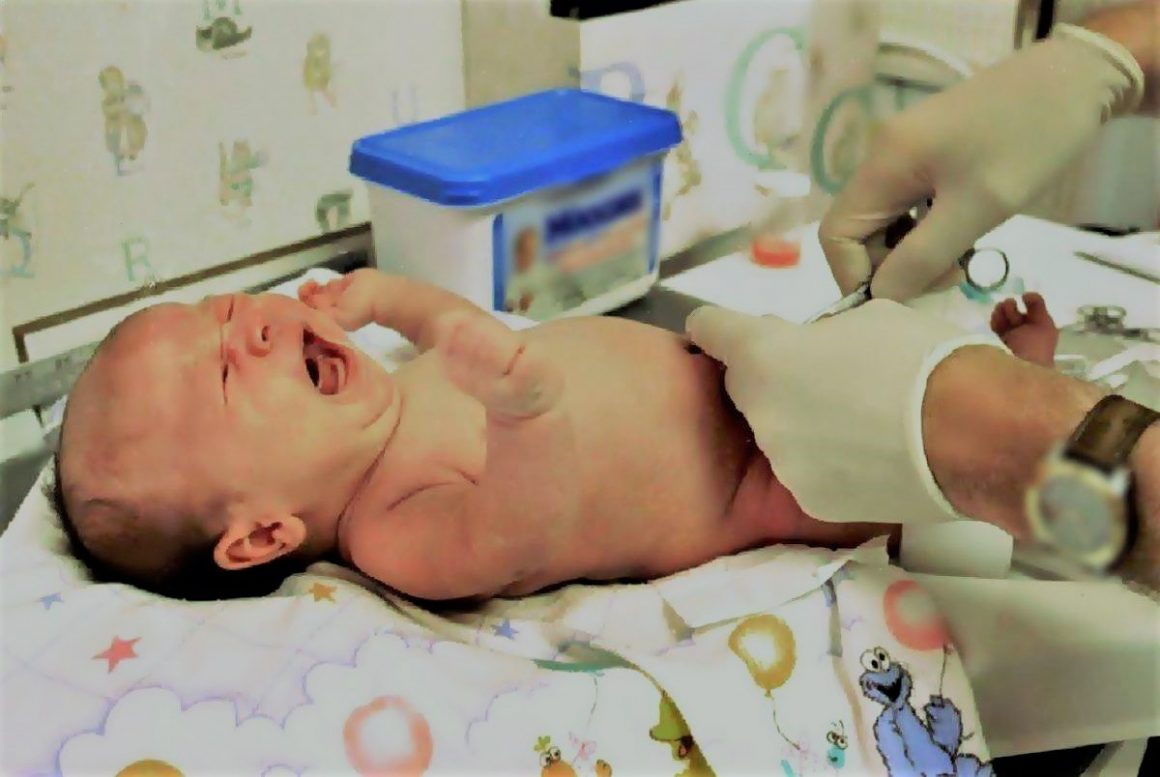 - يتم تثبيت الطفل على ظهره، ويقوم الطبيب بتنظيف منطقة القضيب.
