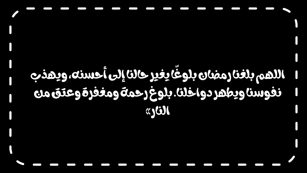 - أيضا «اللهم بلغنا رمضان بلوغًا يغير حالنا إلى أحسنه، ويهذب نفوسنا ويطهر دواخلنا. بلوغ رحمة ومغفرة وعتق من النار».