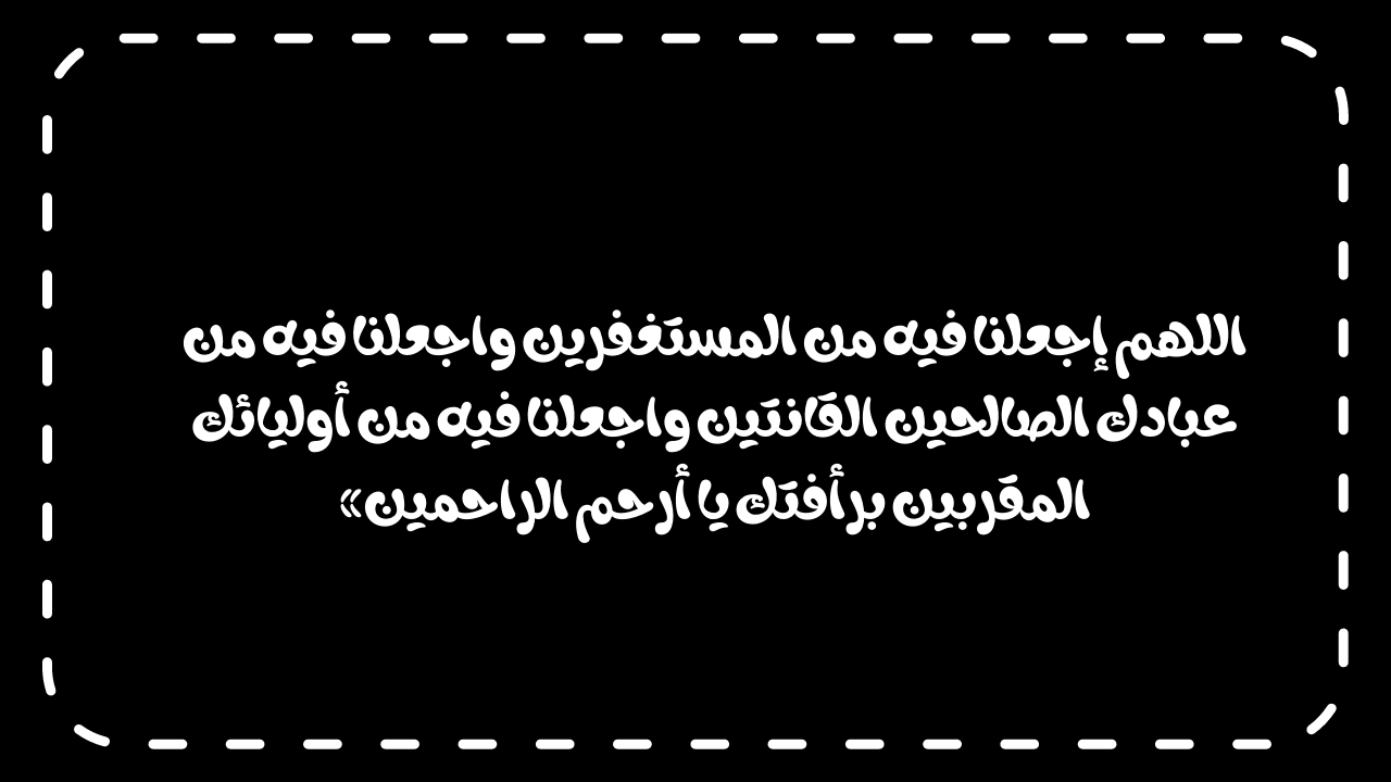 - كذلك «اللهم إجعلنا فيه من المستغفرين واجعلنا فيه من عبادك الصالحين القانتين واجعلنا فيه من أوليائك المقربين برأفتك يا أرحم الراحمين».