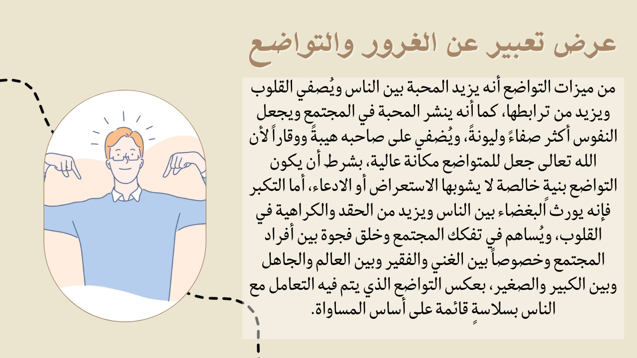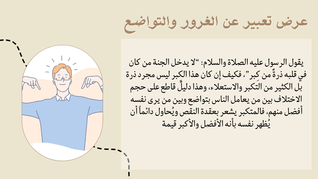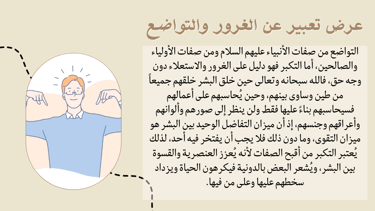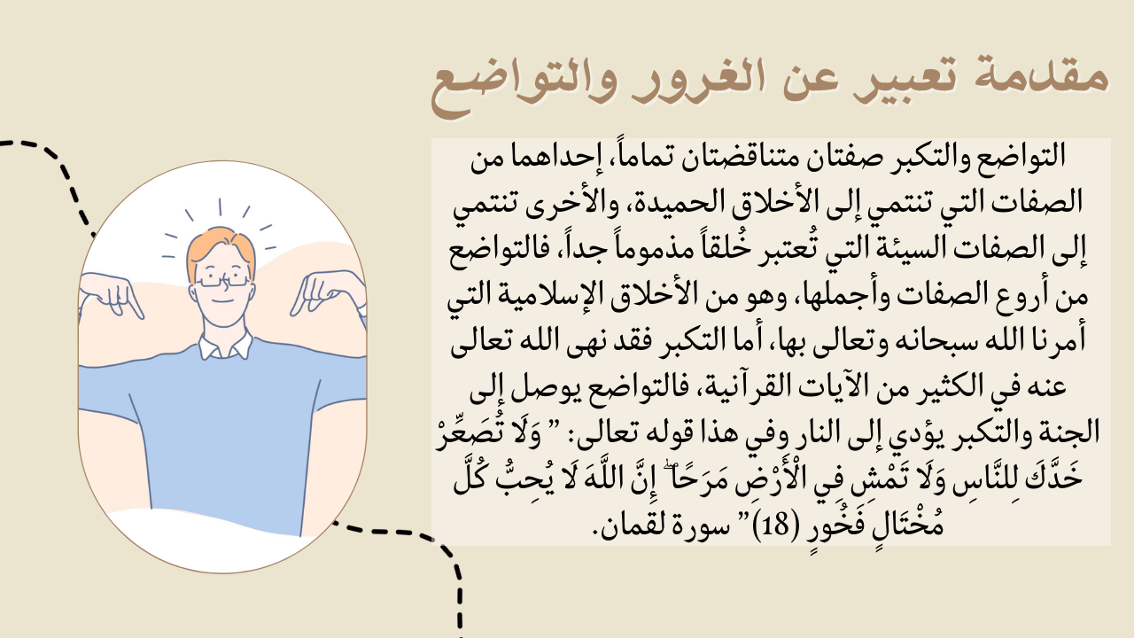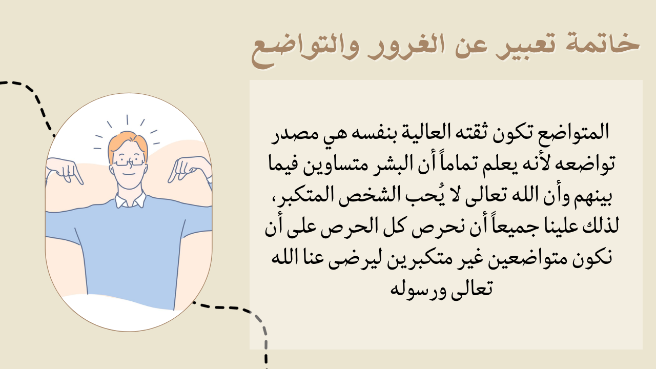 مما لاشك فيه الغرور والتكبر من ضمن الصفات التي تسلب الفضائل من روح الإنسان، كما أنها تجعل هذه الروح مكتسبة للرذائل وكل ما يشوهها، حيث أن اعجاب الإنسان بنفسه ما هو إلا دليل على صغر عقله، وضعف قلبه وشخصيته وانعدام ثقته بنفسه، ومن هذا المنطلق نرفق تعبير عن الغرور والتواضع: