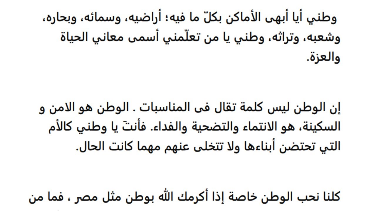 - فالوطن هو الأرض الذي يولد عليها الفرد ويترعرع من خيراته، ويكبر على أرضه، ويعتبر الوطن هو الام الثانية لدي الفرد، وترعيه حتى يبكر ويموت ويدفن في أرضه، ولذلك على كل مواطن ان يقوم بحماية الوطن علي أكمل وجه، وان يقدم ما يستطيع من حماية.