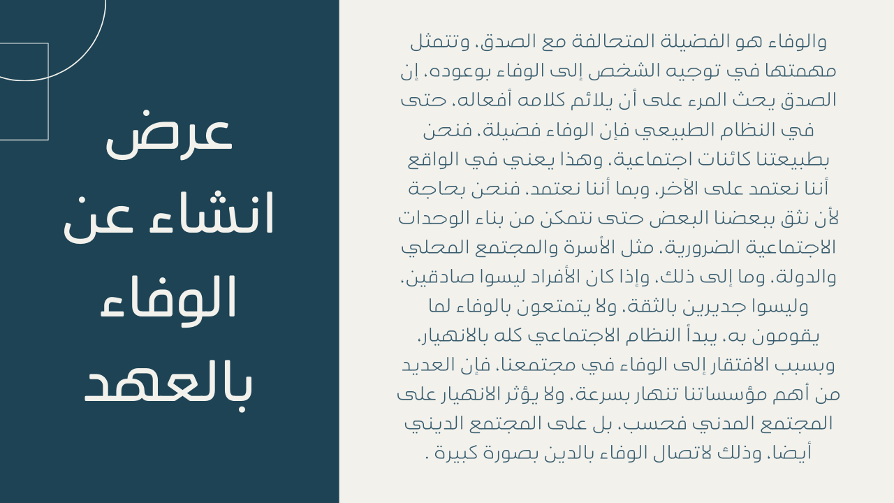 انشاء عن الوفاء بالعهد كونه من الأمور المستحبة عند الله عز وجل، كذلك يساهم في توطيد أواصر المحبة والثقة بين أفراد المجتمع، ويجعله متماسكاً أيضاً.