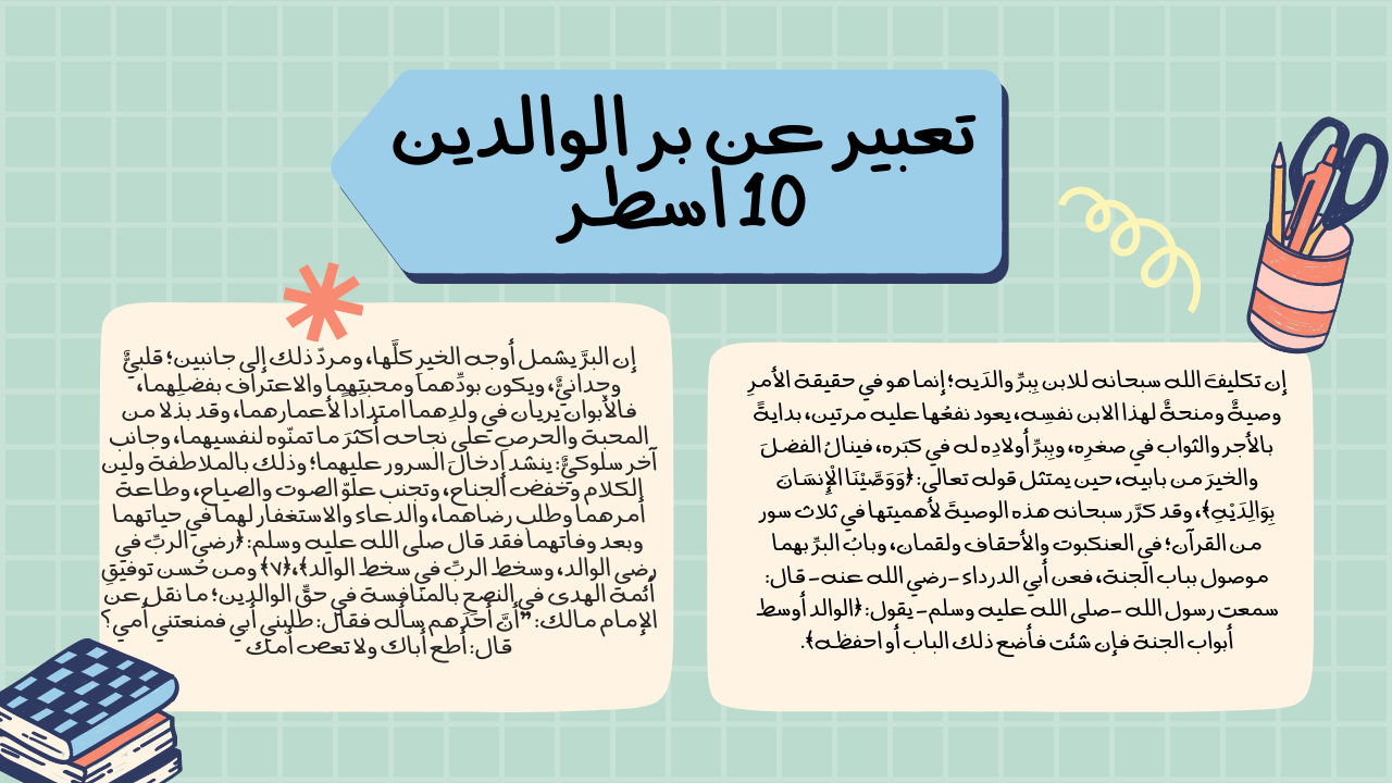 تعتبر مهارة التعبير واحدة من أبرز مهارات اللغة العربية. بها يطلق المتعلم المجال لأفكاره المتمثلة بكلمات يخطها في سطور كتاباته. ولعل من أشهر مواضيع التعبير هو ذلك التعبير الذي يتحد عن بر الوالدين. أعظم عبادة أمرنا الله تعالى بها، وقرنها بعبادته في عدة آيات قرآنية وردت في القرآن الكريم. وهنا سنترك لكم موضوع انشاء عن بر الوالدين كامل العناصر من مقدمة وعرض وخاتمة، وهو كالآتي: