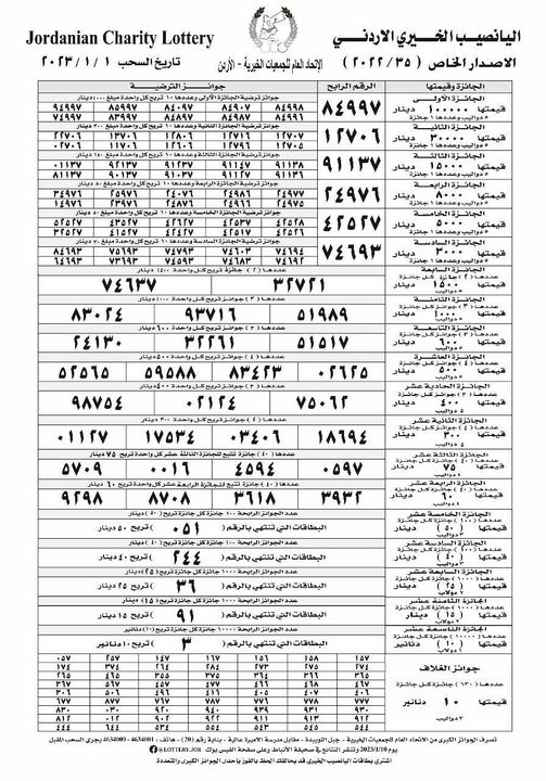 كما أن الصفحة الرسمية على منصة الفيس بوك الخاصة باليانصيب الخيري الأردني، حيث نشر على الصفحة الرسمية على الفيس بوك وعلى صفحة اليوتيوب الخاص باليانصيب الخيري الأردني، نشر فيديو يظهر أرقام بالطاقات التي حصلت على الجوائز في اليوم الأول من عام 2025، كما أن الجائزة الكبرى في اليانصيب الخيري الأردني حوالي مائة آلاف دينار أردني، حيث يكون الأغلب يريد الحصول عليها، حيث كان من المقرر أن يخرج في الأول من شهر يناير لعام 2025، كما يلي: