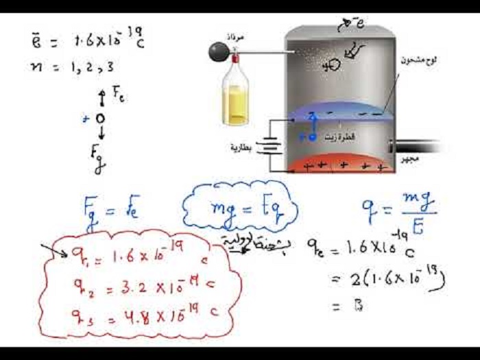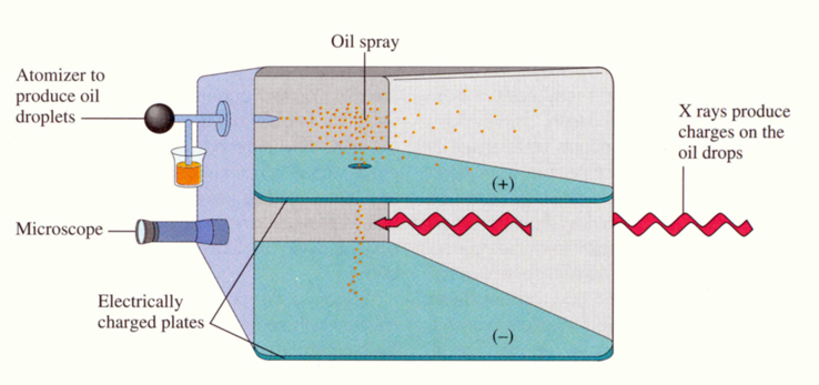 - وبالتجريب لاحظ أن قياس الشحنة الكهربائية لقطرات زيت مختلفة، تكون مضاعفات لشحنة مفردة صغيرة تعرف باسم الشحنة نظرتيية e.