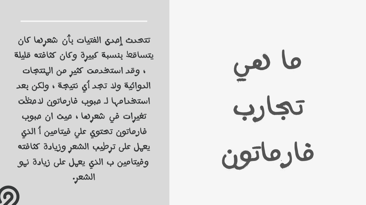- والتي برز منها حبوب فارماتون التي تعوض الشعر النقص الذي يخص العناصر الغذائية التي لها القدرة على زيادة حيوية ونشاط الشعر وتقويته من الجذور، وإضافة المكونات القوية التي تعمل على تسريع اطالته، وأيضاً على زيادة كثافة الخصلة ذاتها، حيث تبين أن حبوب فارماتون تحتوي على مواد مضادة للأكسدة والتي لها القدرة على التخلص من تقصف الشعر، ويكون هذا من خلال محاربة الجذور الحرة، التي تسببت في تقصف وتساقط وتكسر الشعر، وهذا يعزى إلى أن حبوب فارماتون تحتوي على البيوتين الذي يعمل على تحسين الدورة الدموية، وبالتالي الحصول على النتائج العظيمة والفوائد الجمة التي ستعم على شعرك وجسمك منه.