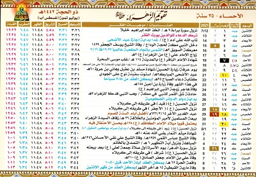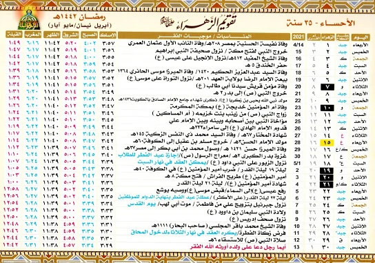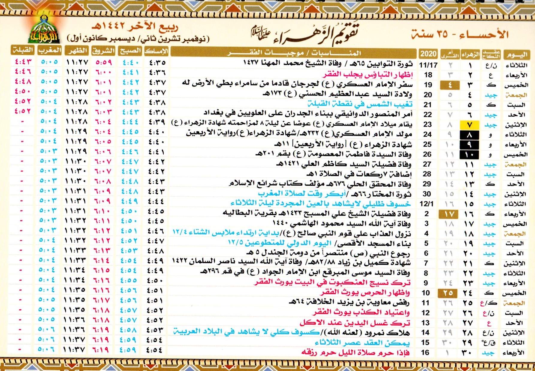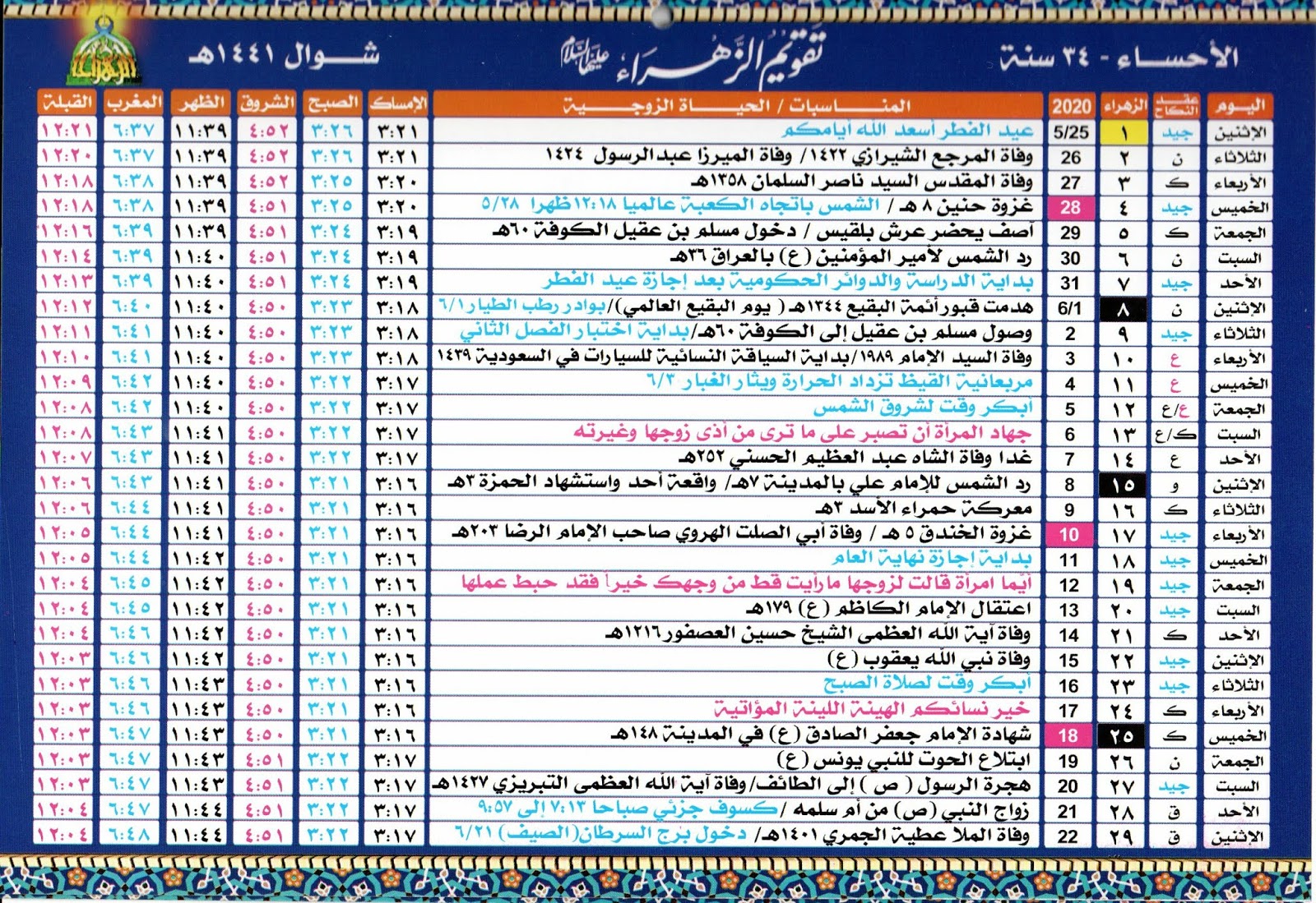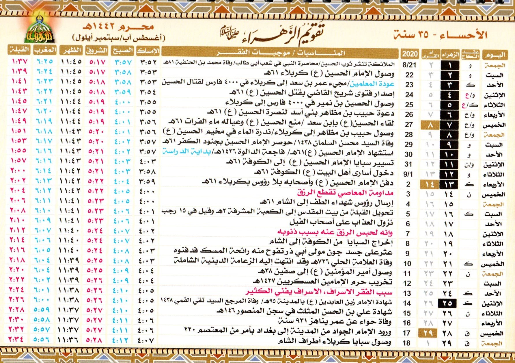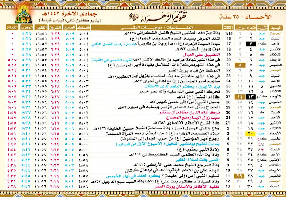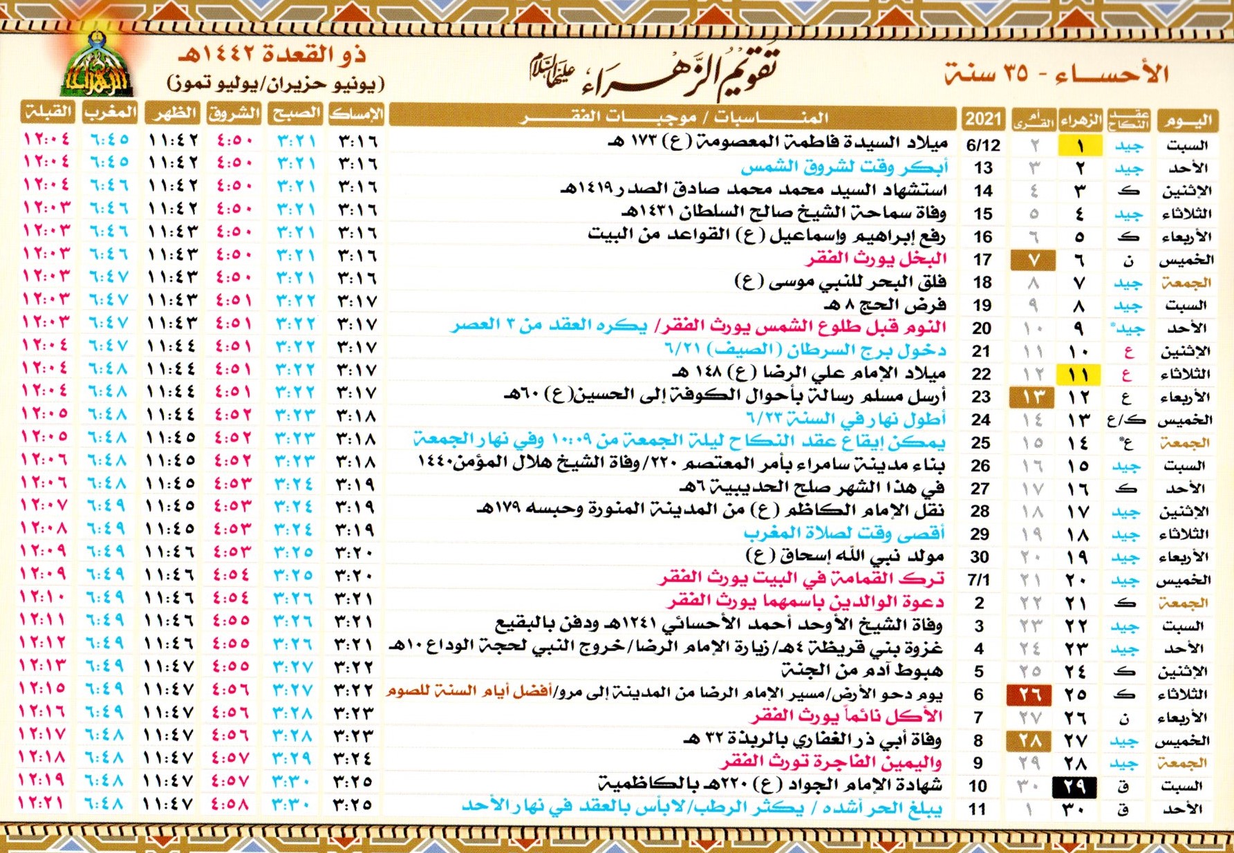 حيث يتبع المسلمين من الطائفة الشيعية في منطقة الأحساء بالمملكة العربية السعودية تقويم الزهراء الذي يعتبر من أبرز الإمساكيات المعروفة في تلك المنطقة هناك، بالإضافة إلى ان هذا التقويم يستخدم في معرفة الاوقات التي لها علاقة بالصلوات الخمس علز مدار السنة، ويجدر بالذكر ان البحث يزداد عن هذا التقويم في شهر رمضان المبارك بالإضافة إلى أنه يمكن التعرف على كافة المناسبات الدينية المتنوعة الخاصة بـ شهور السنة الهجرية 1446هجري، ومن خلال ما يلي يمكننا وضع تقويم الزهراء في الأحساء على مدار شهور السنة الهجرية ١٤٤٣، وذلك بدءا من تقويم شهر محرم وصولا إلى شهر ذي الحجة لعام ١٤٤٣ هجري.