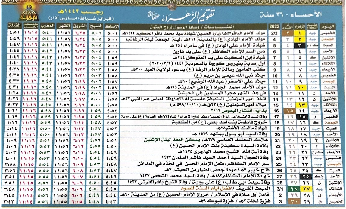 كما ويعتبر شهر رجب الشهر السابع من اشهر السنة الميلادية للتقويم الهجري لعامنا الحالي عام ١٤٤٣ وذلك بناء على تقويم الزهراء الأحساء، ومن خلال ما يلي نرفق صورة تقويم الزهراء شهر صفر ١٤٤٣: