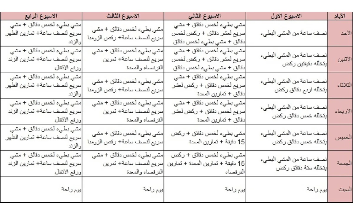 جدول تمارين للمبتدئين للنساء، تمارين اللياقة البدنية هي عملية مهمة لصحة جسم الإنسان وتتيح الحفاظ على حالة صحية جيدة وتحسين جودة الحياة، ومن أهم فوائدها، تؤدي التمارين الرياضية إلى تحسين الصحة العامة للجسم، حيث تعمل على تعزيز القلب والأوعية الدموية وتحسين الجهاز التنفسي وتقوية العضلات والعظام، أيضا، يمكن للتمارين الرياضية المنتظمة أن تقلل من خطر الإصابة بالعديد من الأمراض المزمنة، مثل: أمراض القلب والسكري والسرطان والسمنة وأمراض الكبد وغيرها، وهنا جدول تمارين للمبتدئين للنساء.
