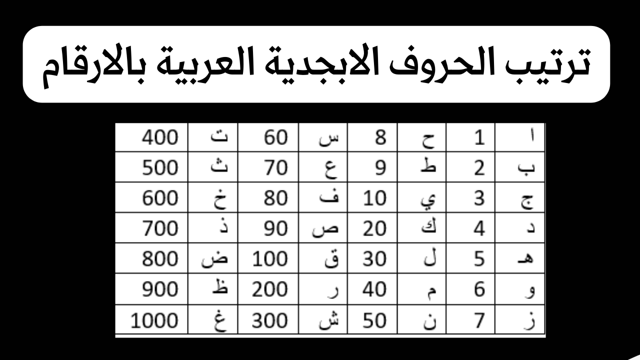 تعدد الأساليب التي تترتب من خلالها حروف اللغة العربية دليل واضح على المميزات الكثيرة التي تتميز بها هذه اللغة والعراقة والاصالة التي لا يمكن ايجاد مثيل لها في أي لغة أخرى مهما كانت مميزاتها، ومن الأساليب المميزة لترتيب حروف الهجاء العربية طريقة ترتيبها من خلال منح كل حرف من هذه الحروف رقم معين خاص به، وهذه الطريقة تتمحور بالشكل التالي: