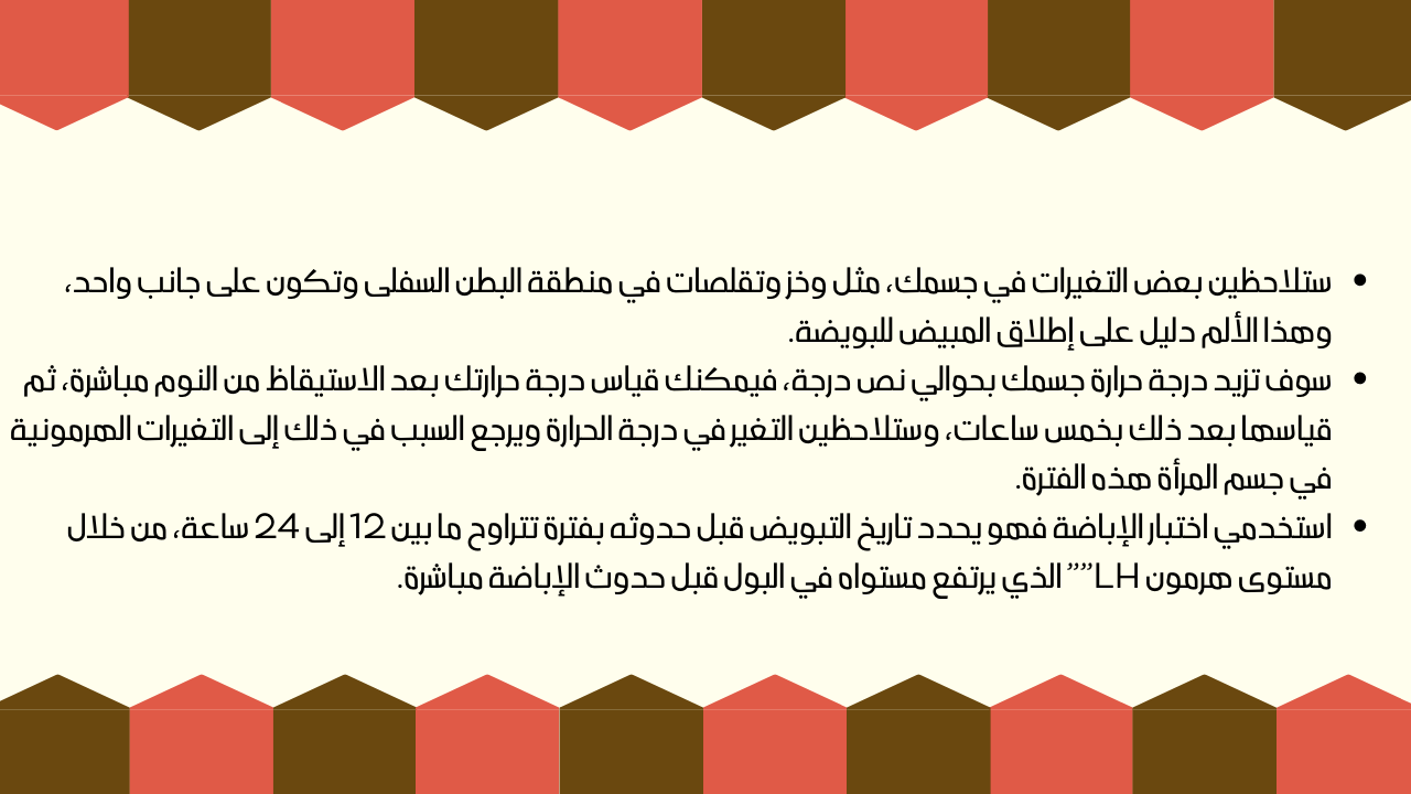 - وهذه الفترة تكون فيها نسبة الخصوبة لدى المرأة معدومة بشكل كلي.