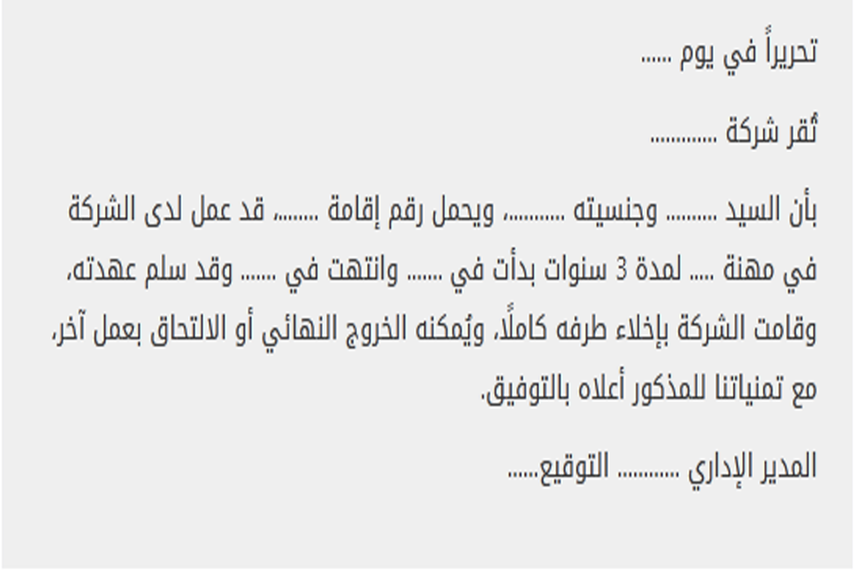 - من أبرز النماذج عن اخلاء طرف هي: تقر شركة أو مؤسسة……. بأن السيد …….. وجنسيته…… ورقم إقامته……. قد عمل لديها في وظيفة….. في الفترة من….وحتى……وقد قام بتسليم عهدته كاملة، وأخلت الشركة طرفه بشكل نهائي، ويستطيع الالتحاق بأي عمل آخر أو وظيفة أخرى، مع خالص التمنيات بالتوفيق.