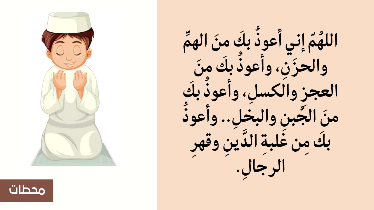 - اللهُمّ إني أعوذُ بكَ منَ الهمِّ والحزَنِ.. وأعوذُ بكَ منَ العجزِ والكسلِ، وأعوذُ بكَ منَ الجُبنِ والبخلِ.. و أعوذُ بكَ مِن غلبةِ الدَّينِ وقهرِ الرجالِ.