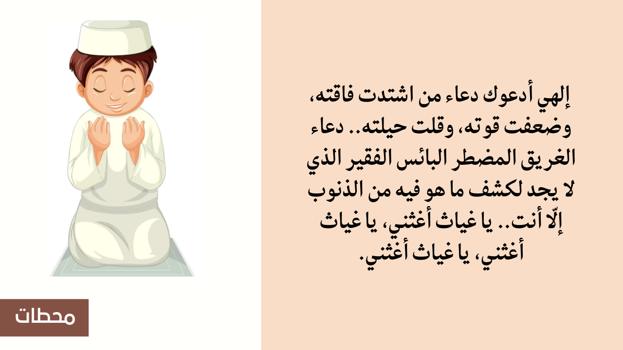 - كذلك إلهي أدعوك دعاء من اشتدت فاقته، وضعفت قوته، وقلت حيلته.. دعاء الغريق المضطر البائس الفقير الذي لا يجد لكشف ما هو فيه من الذنوب إلّا أنت.. يا غياث أغثني، يا غياث أغثني، يا غياث أغثني.