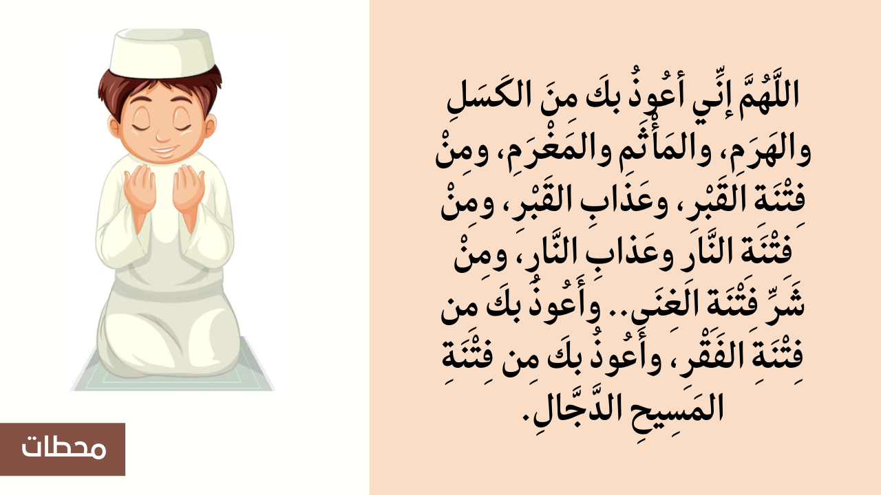 - كذلك اللَّهُمَّ إنِّي أعُوذُ بكَ مِنَ الكَسَلِ والهَرَمِ، والمَأْثَمِ والمَغْرَمِ.. ومِنْ فِتْنَةِ القَبْرِ، وعَذابِ القَبْرِ.. و مِنْ فِتْنَةِ النَّارِ وعَذابِ النَّارِ، ومِنْ شَرِّ فِتْنَةِ الغِنَى، وأَعُوذُ بكَ مِن فِتْنَةِ الفَقْرِ، وأَعُوذُ بكَ مِن فِتْنَةِ المَسِيحِ الدَّجَّالِ.