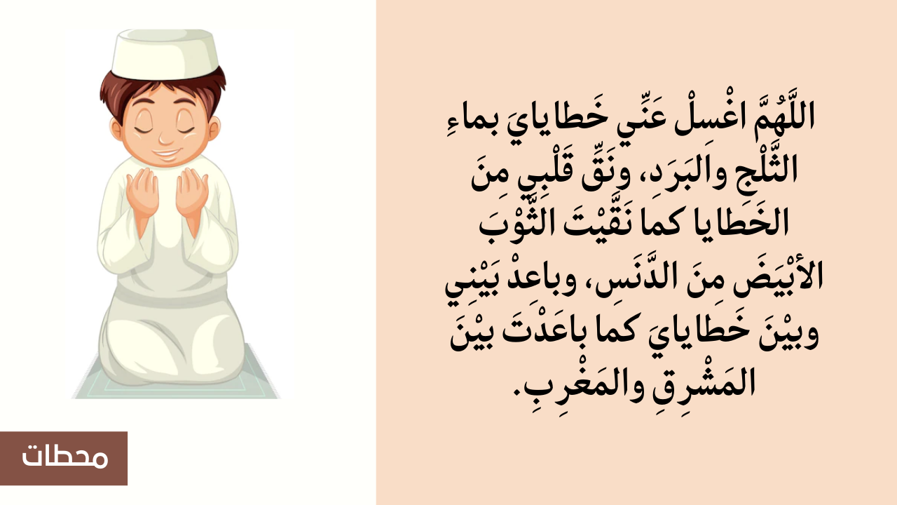 - أيضا اللَّهُمَّ اغْسِلْ عَنِّي خَطايايَ بماءِ الثَّلْجِ والبَرَدِ، ونَقِّ قَلْبِي مِنَ الخَطايا كما نَقَّيْتَ الثَّوْبَ الأبْيَضَ مِنَ الدَّنَسِ، وباعِدْ بَيْنِي وبيْنَ خَطايايَ كما باعَدْتَ بيْنَ المَشْرِقِ والمَغْرِبِ.