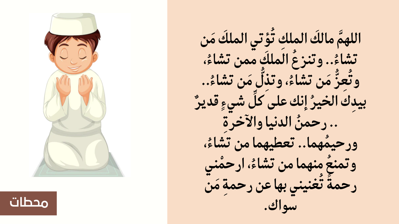 - أيضا اللهم مالك الملك تؤتي الملك من تشاء وتنزع المُلك ممن تشاء وتعز من تشاء.. وتذلّ من تشاء، بيدك الخير إنك على كل شيء قدير.