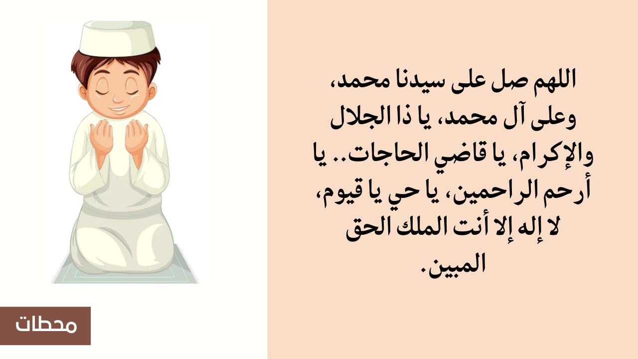 - اللهم صل على سيدنا محمد، وعلى آل محمد، يا ذا الجلال والإكرام، يا قاضي الحاجات.. يا أرحم الراحمين، يا حي يا قيوم، لا إله إلا أنت الملك الحق المبين.