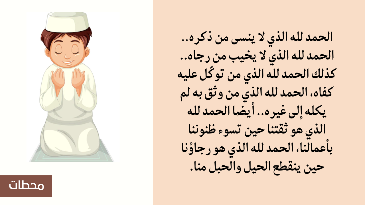 - أيضا الحمد لله الذي لا ينسى من ذكره.. الحمد لله الذي لا يخيب من رجاه.. كذلك الحمد لله الذي من توكّل عليه كفاه، الحمد لله الذي من وثق به لم يكله إلى غيره.. أيضا الحمد لله الذي هو ثقتنا حين تسوء ظنوننا بأعمالنا، الحمد لله الذي هو رجاؤنا حين ينقطع الحيل والحبل منا.