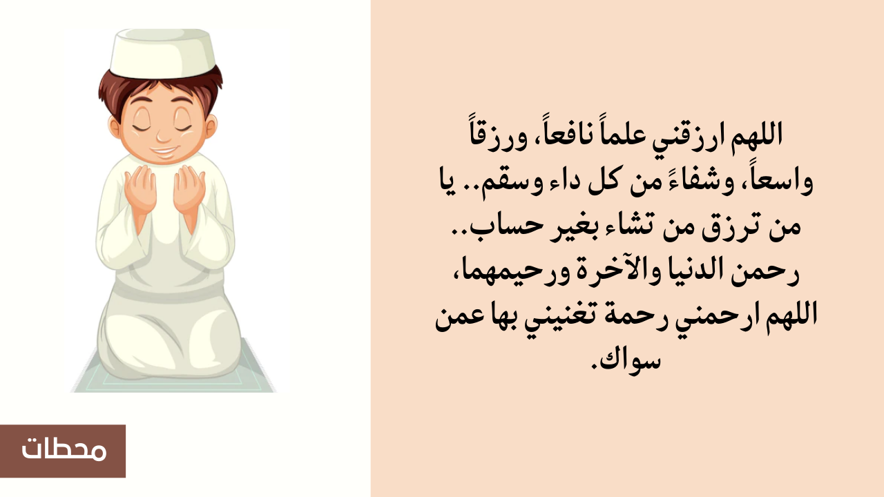 - اللهم ارزقني علماً نافعاً، ورزقاً واسعاً، وشفاءً من كل داء وسقم.. يا من ترزق من تشاء بغير حساب.. رحمن الدنيا والآخرة ورحيمهما، اللهم ارحمني رحمة تغنيني بها عمن سواك.