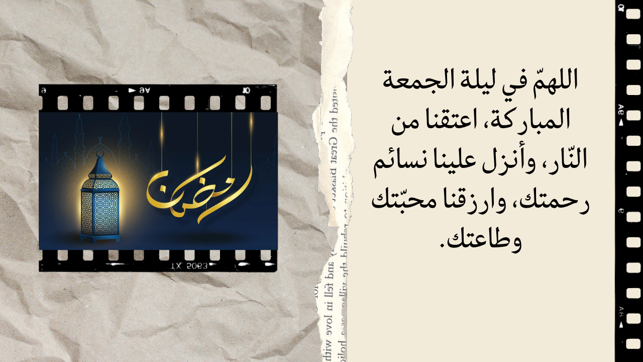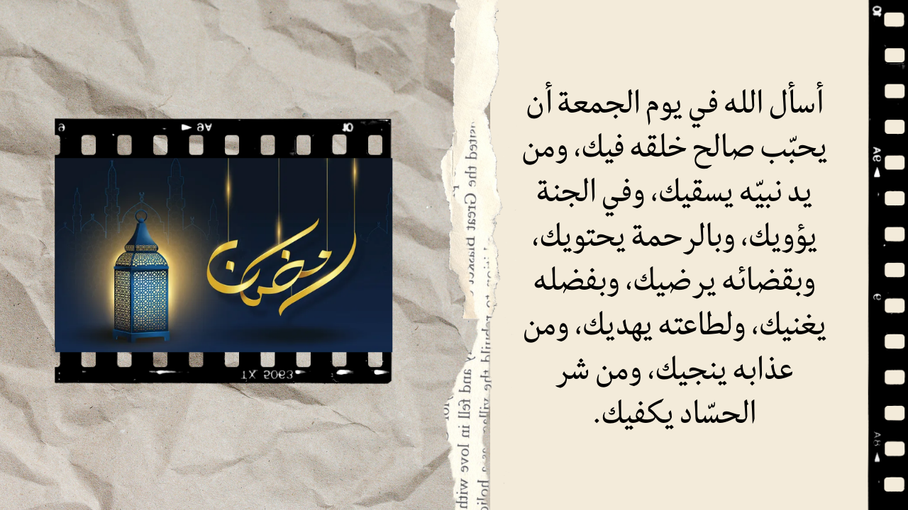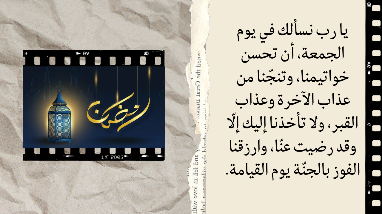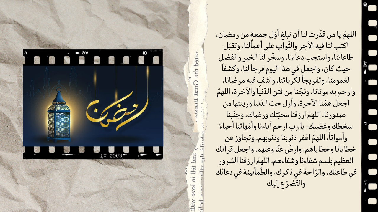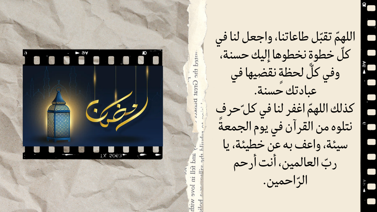- اللهمّ يا من قدّرت لنا أن نبلغ أوّل جمعةٍ من رمضان.. اكتب لنا فيه الأجر والثّواب على أعمالنا.. وتقبّل طاعاتنا.