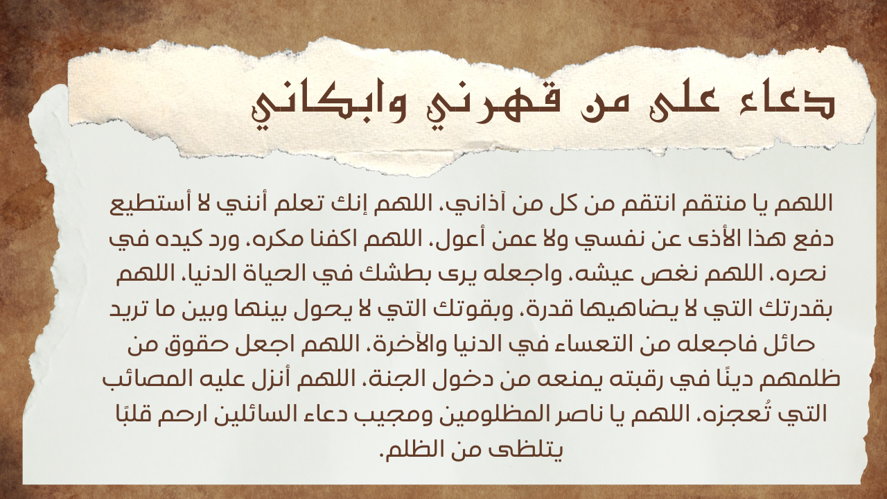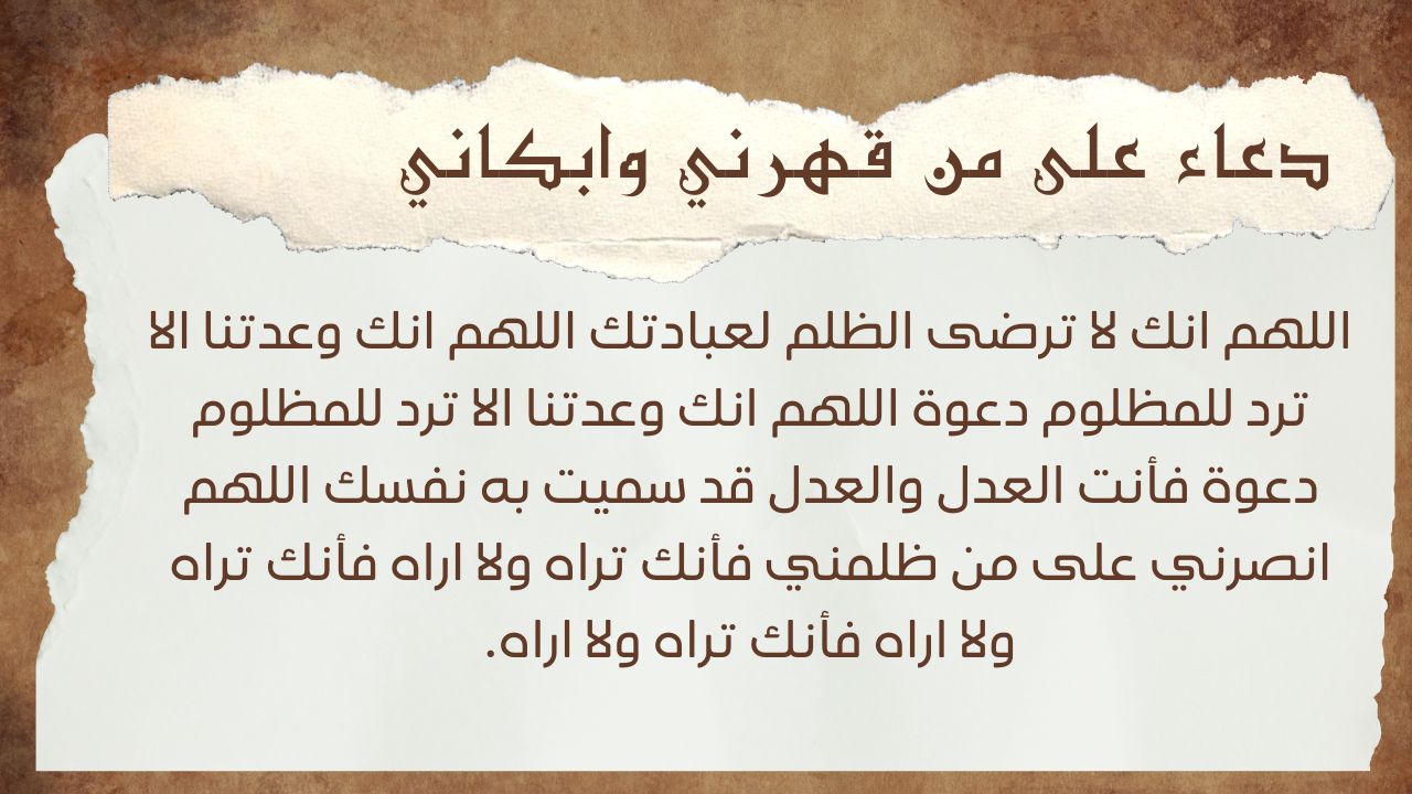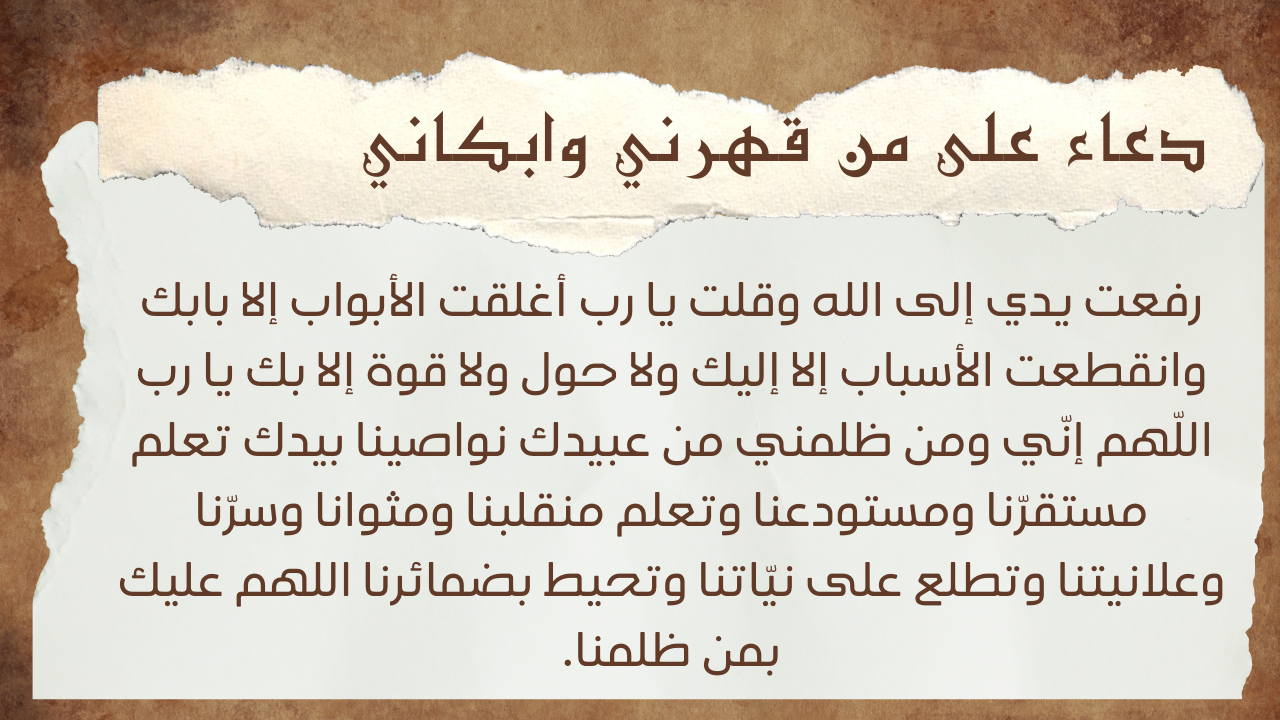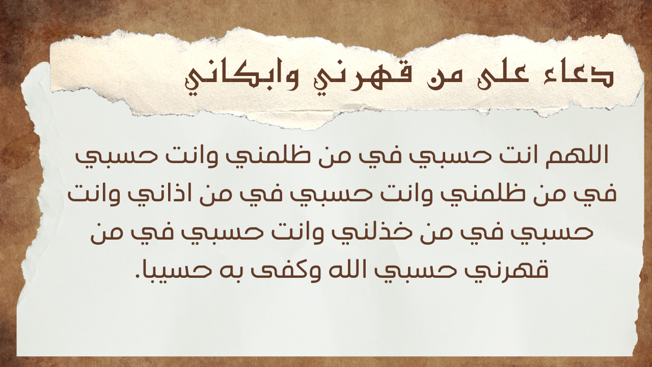 دعاء على من قهرني وابكاني، حيث أن الدعاء هو السبيل الذي يتخلص من خلاله الإنسان من كل ما يثقل كاهله، كما يتجاوز به الأحزان التي تثاقلت على قلبه والظلم الذي أزاح الفرح عن حياته.
