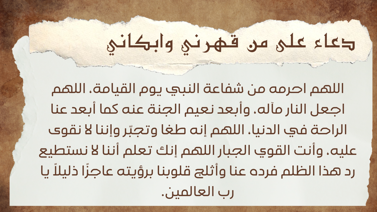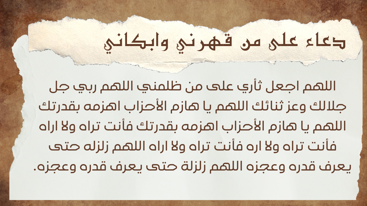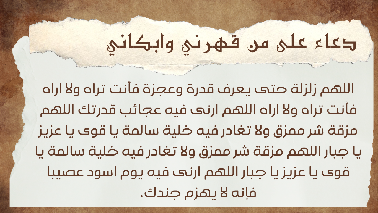 - اللهم زلزلة حتى يعرف قدرة وعجزة فأنت تراه ولا اراه فأنت تراه.. ولا اراه اللهم ارنى فيه عجائب قدرتك ..اللهم مزقة شر ممزق ولا تغادر فيه خلية سالمة يا قوى يا عزيز يا جبار.. كذلك اللهم مزقة شر ممزق ولا تغادر فيه خلية سالمة يا قوى يا عزيز يا جبار اللهم ارنى فيه يوم اسود عصيبا فإنه لا يهزم جندك.
