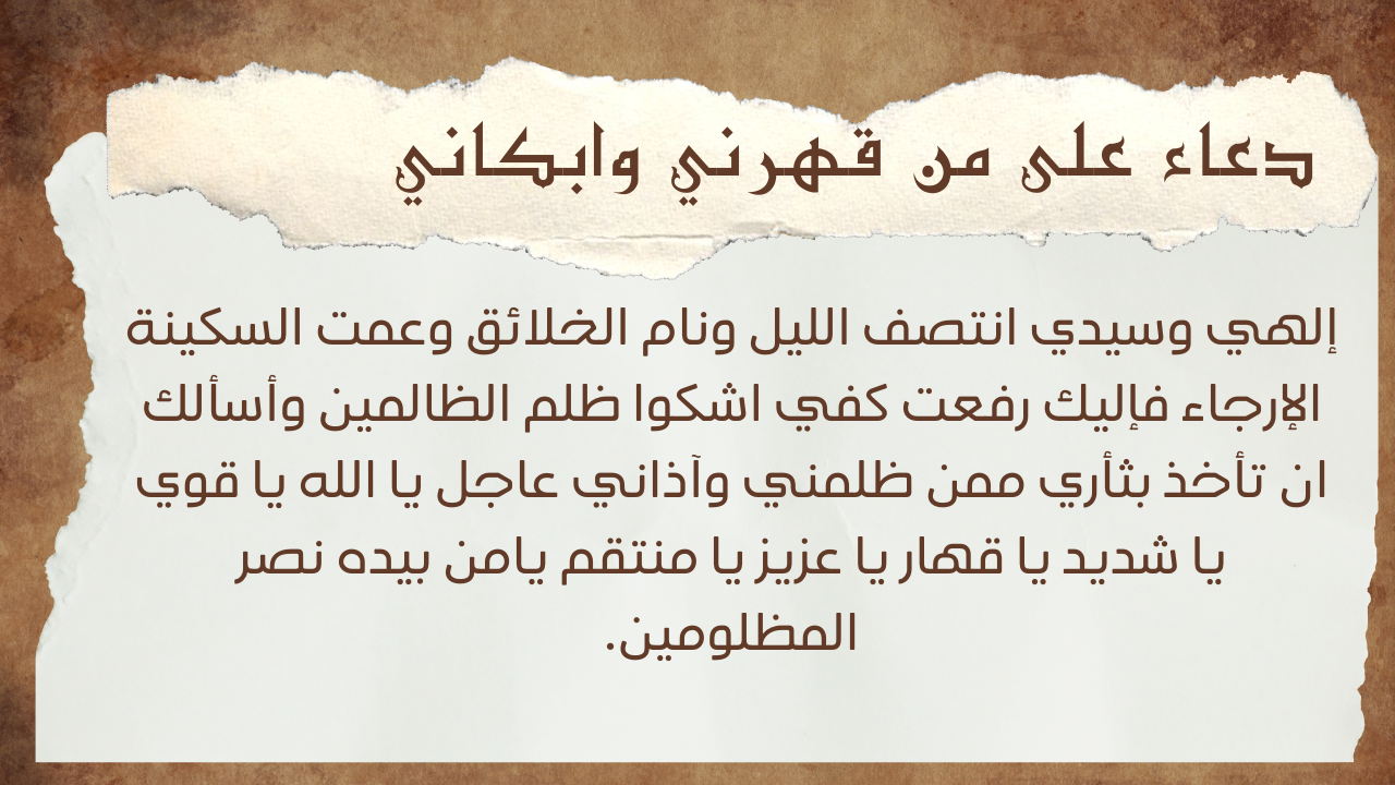 - بالإضافة إلى إلهي وسيدي انتصف الليل ونام الخلائق وعمت السكينة الإرجاء فإليك رفعت كفي اشكوا ظلم الظالمين.. و أسألك ان تأخذ بثأري ممن ظلمني وآذاني عاجل.