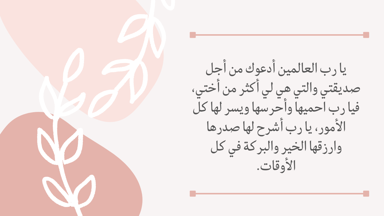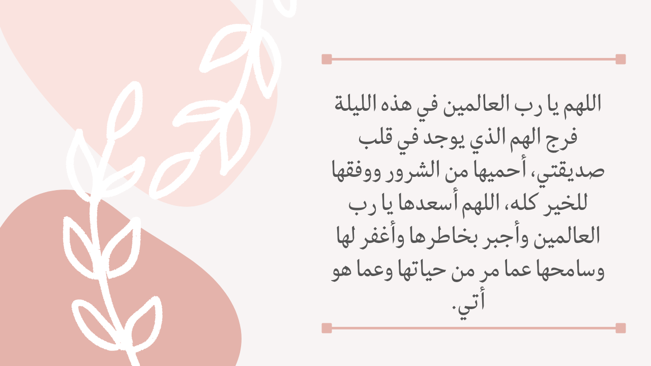 - يا رب إن لي صديقة هي الأقرب إلى قلبي والرفيقة الأحب إلى روحي.. اللهم هب لها ما تطلبه من كل خير.. وارزقها حسنة في الدنيا، وحسنة في الآخرة، ووفقها لعمل ما تُحبه وترضى.. كفر عنها سيئاتها، واستر يا رب ذنوبها، واعف عنها ما تقدم من ذنبها وما تأخر يا رحمن يا رحيم يا أكرم الأكرمين.