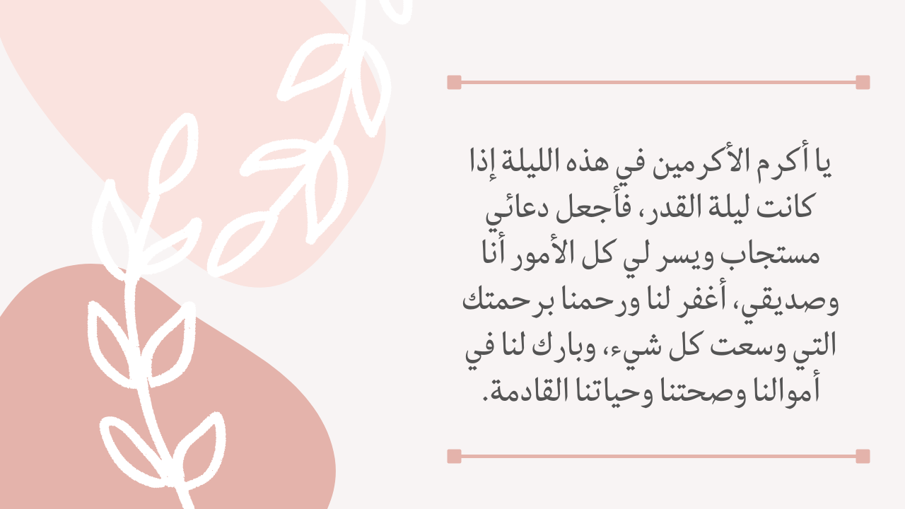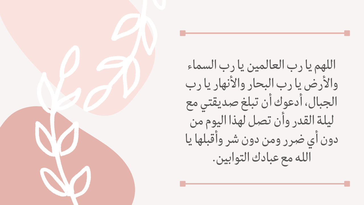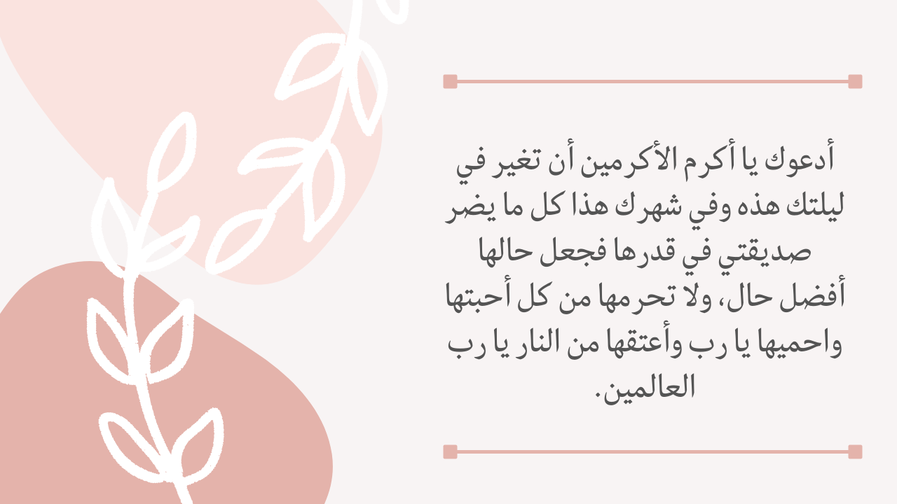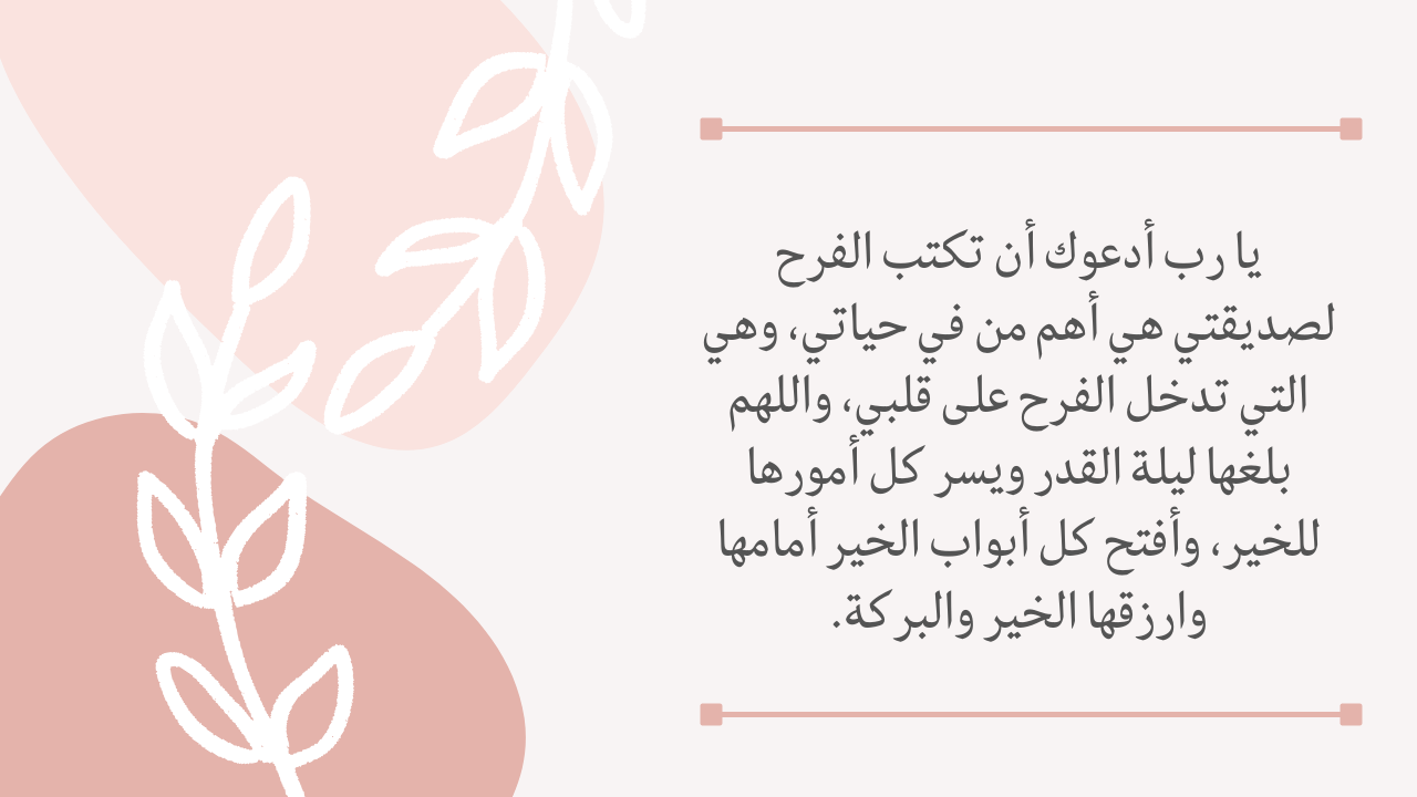 - كذلك يارب في ليله القدر أجعل لصديقتي ايام جميلة مليئة بالسعاده.. و لا تدع شيئا يكسر قلبها الجميل يارب أن تجب دعاء من يتوسل إليك.. كذلك اللهم أسعد صديقتي سعاده ما لها نهايه و كن بعونها و إن تشعر بضيق يارب ابعدها عنها.