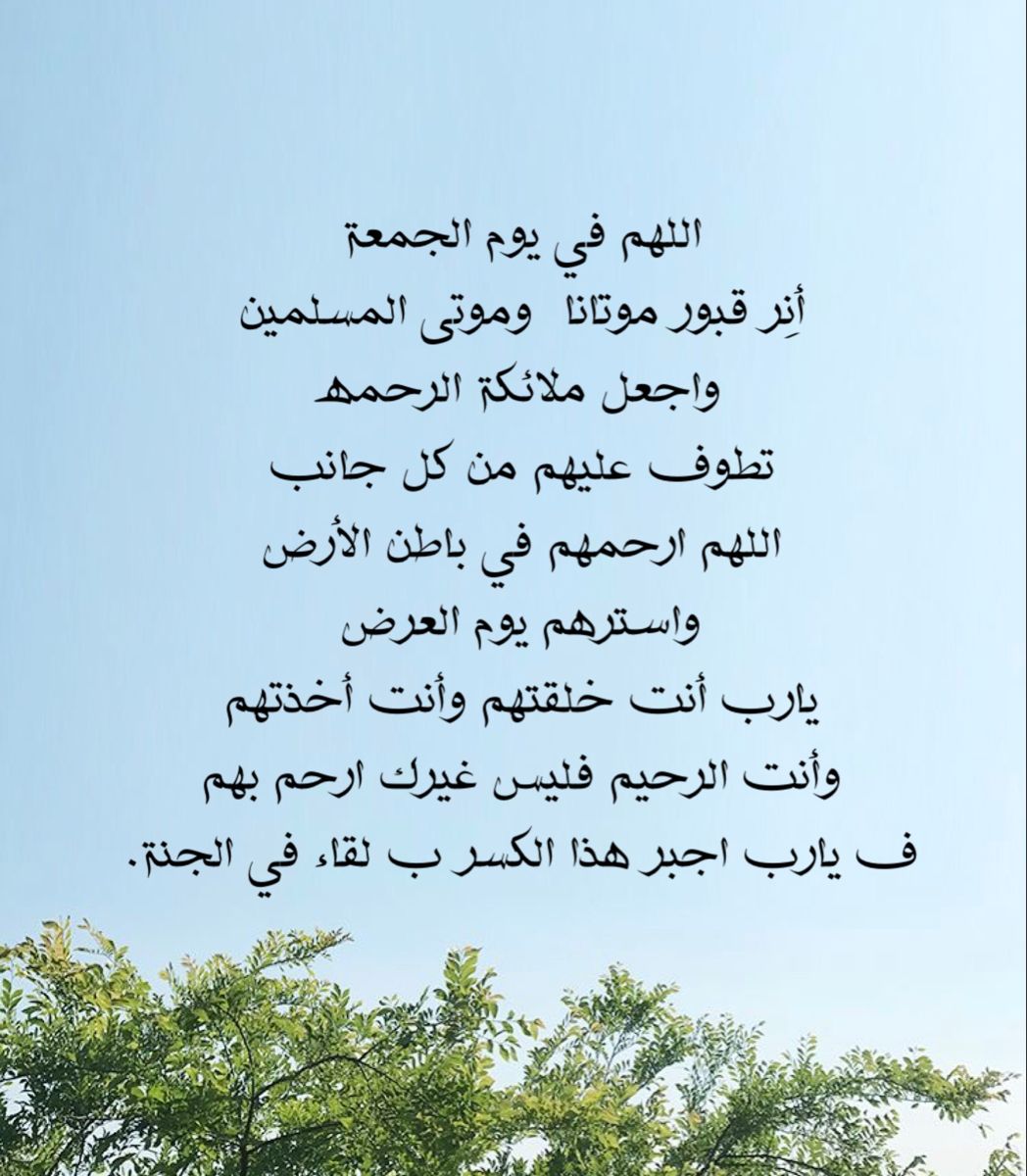 - اللهم ارحم من بقت حياتهم تنبض في ذاكرتنا وخلت أماكنهم بيننا واختفت أصواتهم عن مسامعنا وأجعل لقاءنا الطويل الفردوس الأعلى في يوم الجمعة.