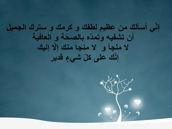 - اللهم لا حول ولاقوة إلا بك، اللهم إني أسألك من عظيم لطفك وكرمك وسترك الجميل أن تشفيه وتمده بالصحة والعافية فأنت على كل شيء قدير.