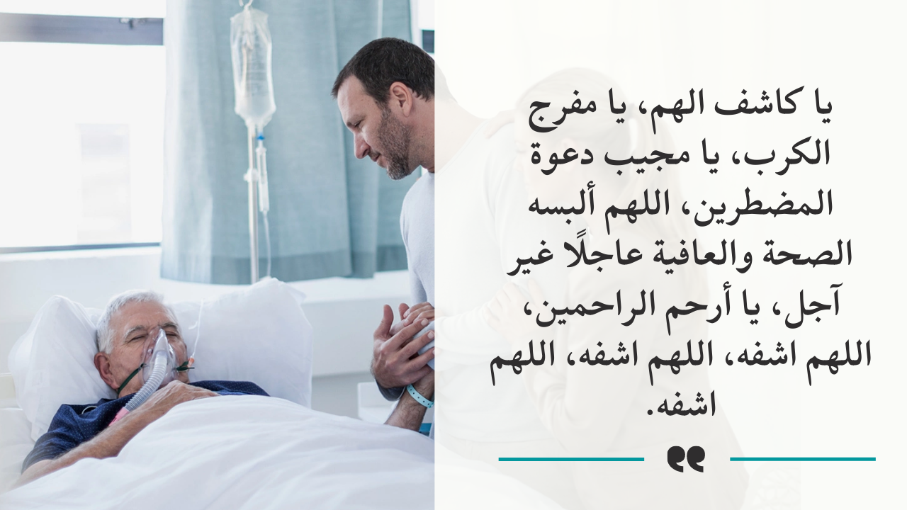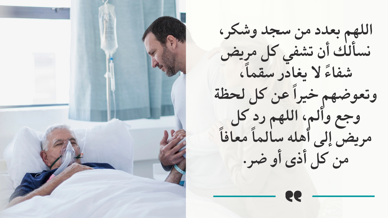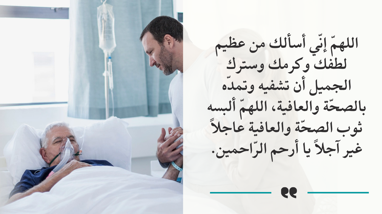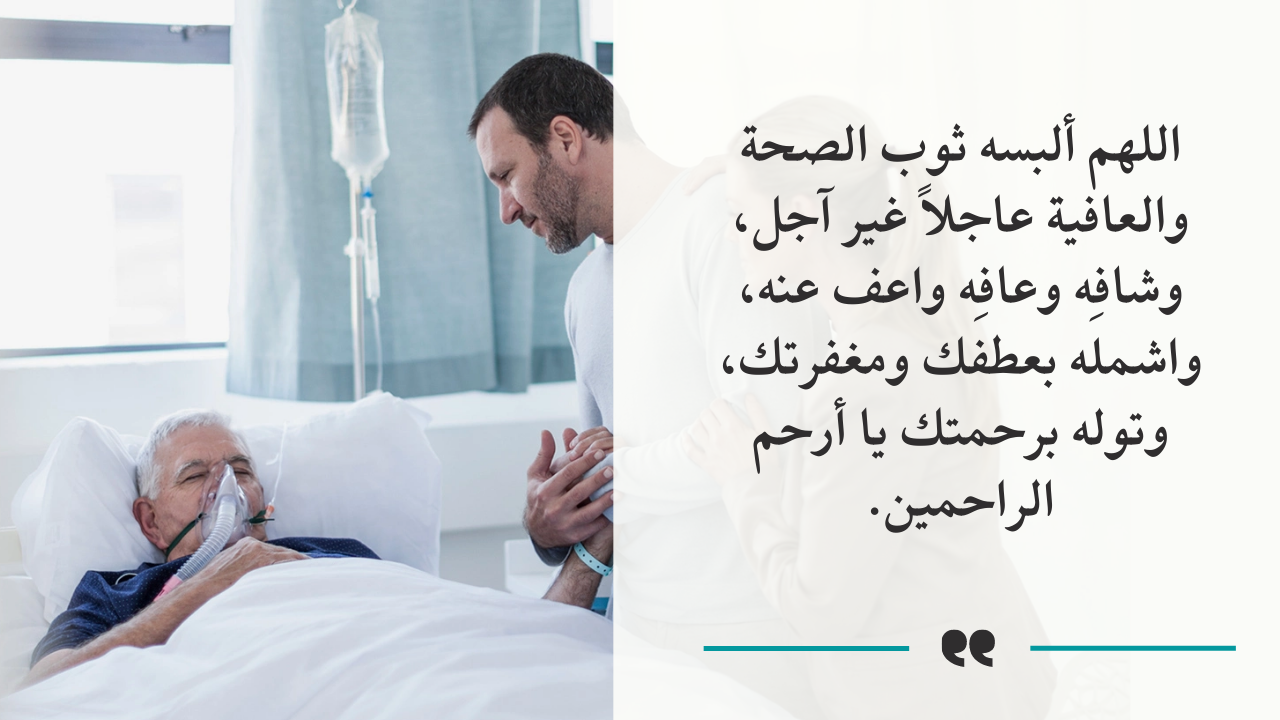 - بالإضافة إلى اللهم يا سامع دعاء العبد إذا دعاك.. يا شافي المريض بقدرتك.. كذلك اللهم اشفه شفاء لا يغادر سقماً.. أيضا اللهم ألبسه لباس الصحة والعافية يارب العالمين.