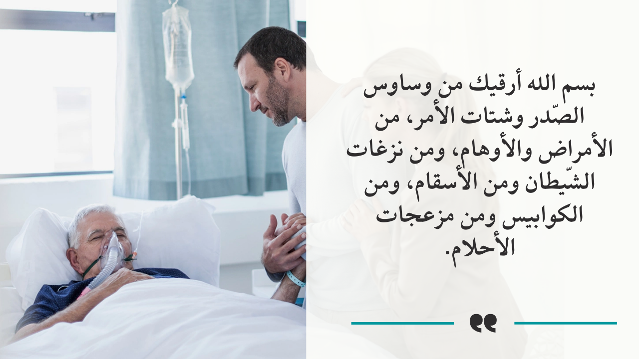 - بسم الله أرقيك.. من وساوس الصّدر وشتات الأمر، ومن الأمراض والأوهام.. ومن نزغات الشّيطان، ومن الأسقام، ومن الكوابيس، ومن مزعجات الأحلام.