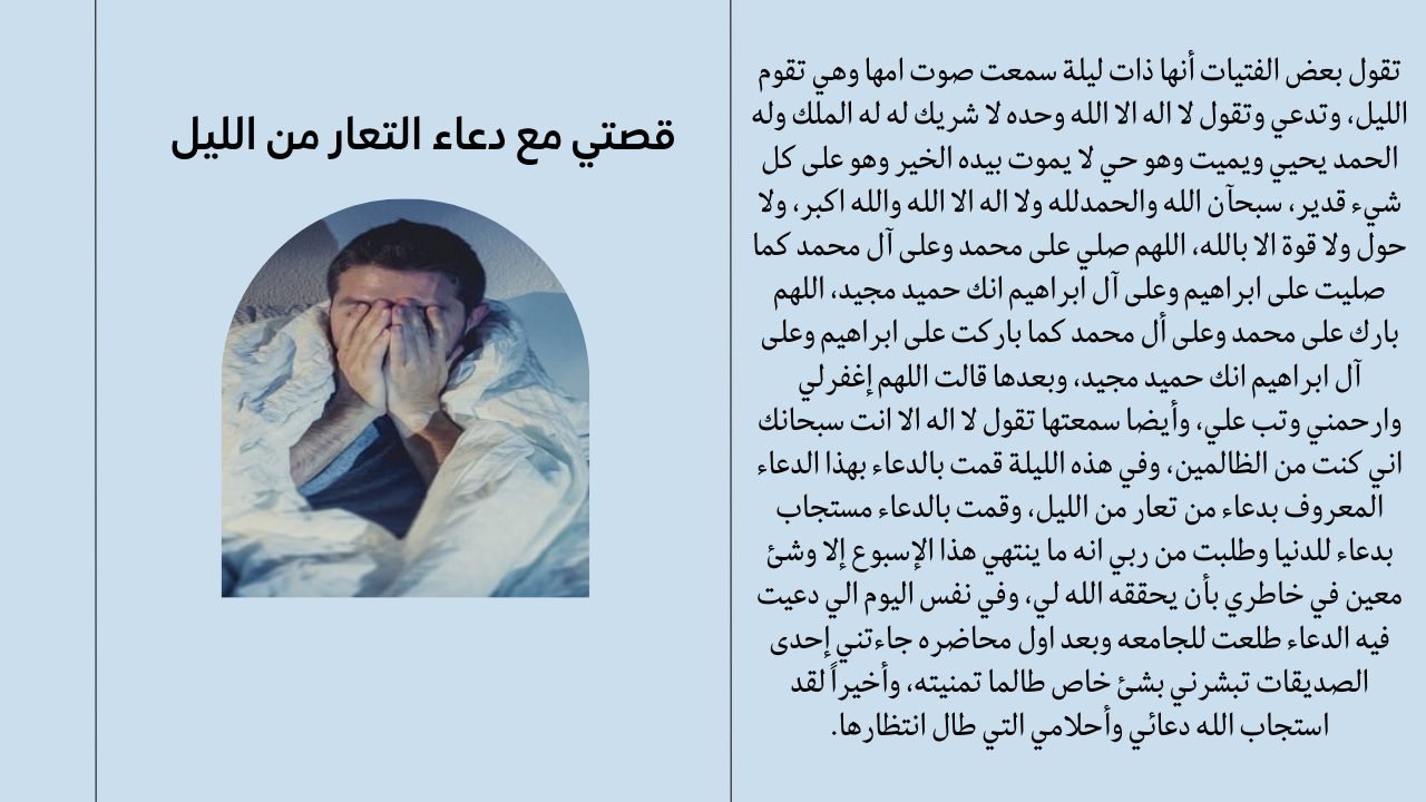 يجد المسلم في الدعاء راحة كبيرة جداً، حيث ينزل على صدره بالسكينة والطمأنينة التي تجعله يتوجه دوماً لله ويدعوه بكل ما يتمناه، كما أن السكينة التي تحل على أفئدة المسلمين تبعاً للدعاء لا يمكن وصفها أبداً، فهي تتدفق في أرواحهم وتسقيها من بعد ظمأ، ولهذا لا يتوانى المسلمون أبداً في ترديد الكثير من الأدعية ومنها دعاء من تعار من الليل: