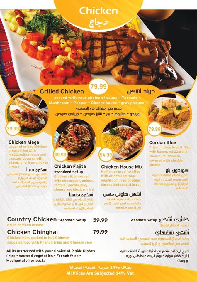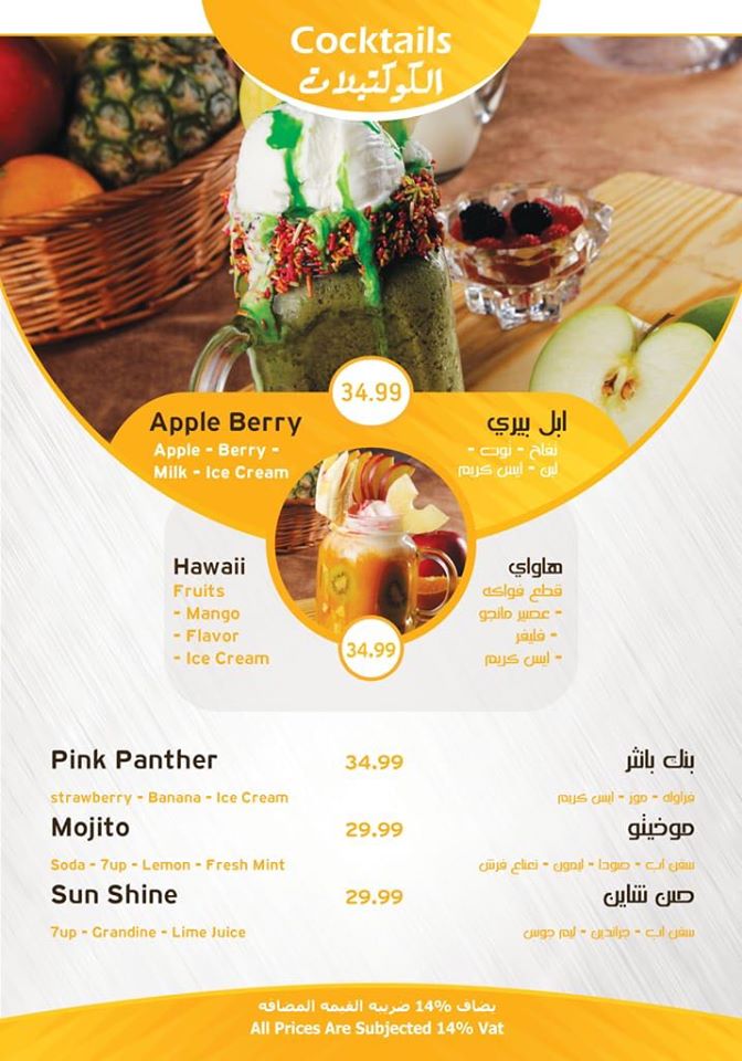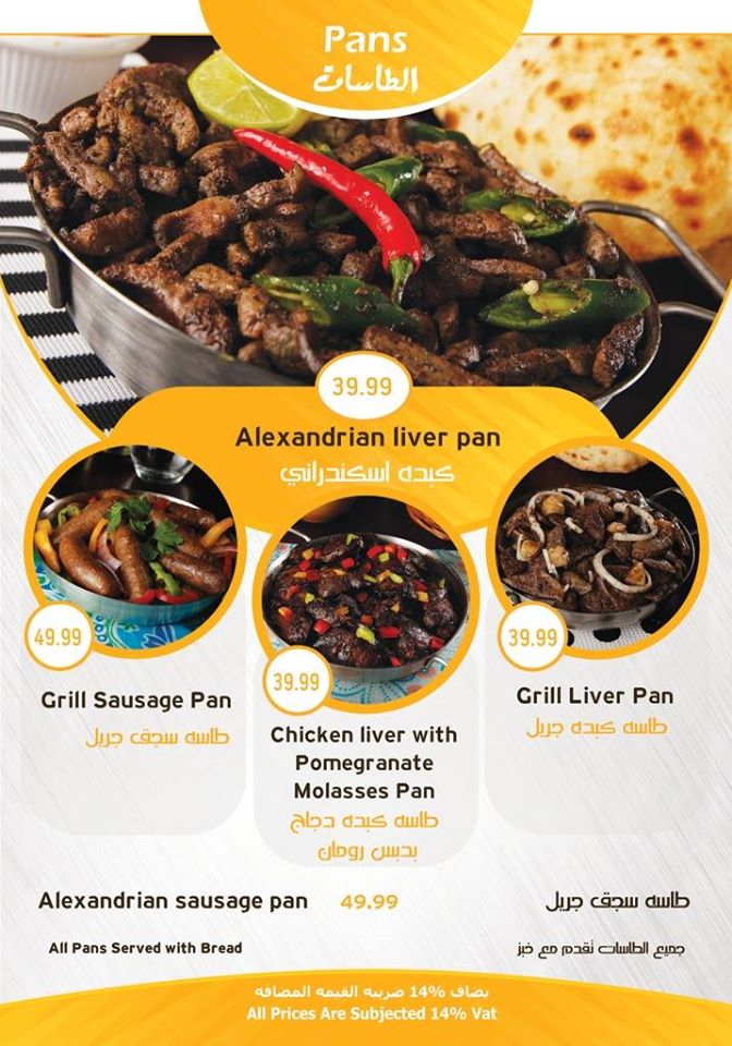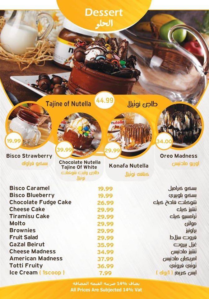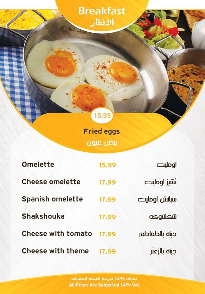 يقدم المطعم الوجبات المتنوعة والمختلفة للإفطار، والغذاء، والعشاء، والوجبات السريعة بأسعار مناسبة تناسب جميع الفئات في الدولة، حرص المطعم بشكل كبير على تقديم الوجبات بأشكال عصرية حديثة، وتلبية احتياجات الزبائن من الوجبات الجديدة المبتكرة المتنوعة والمختلفة، لذلك سنقوم بعرض المنيو الخاص بالمطعم للاطلاع عليه: